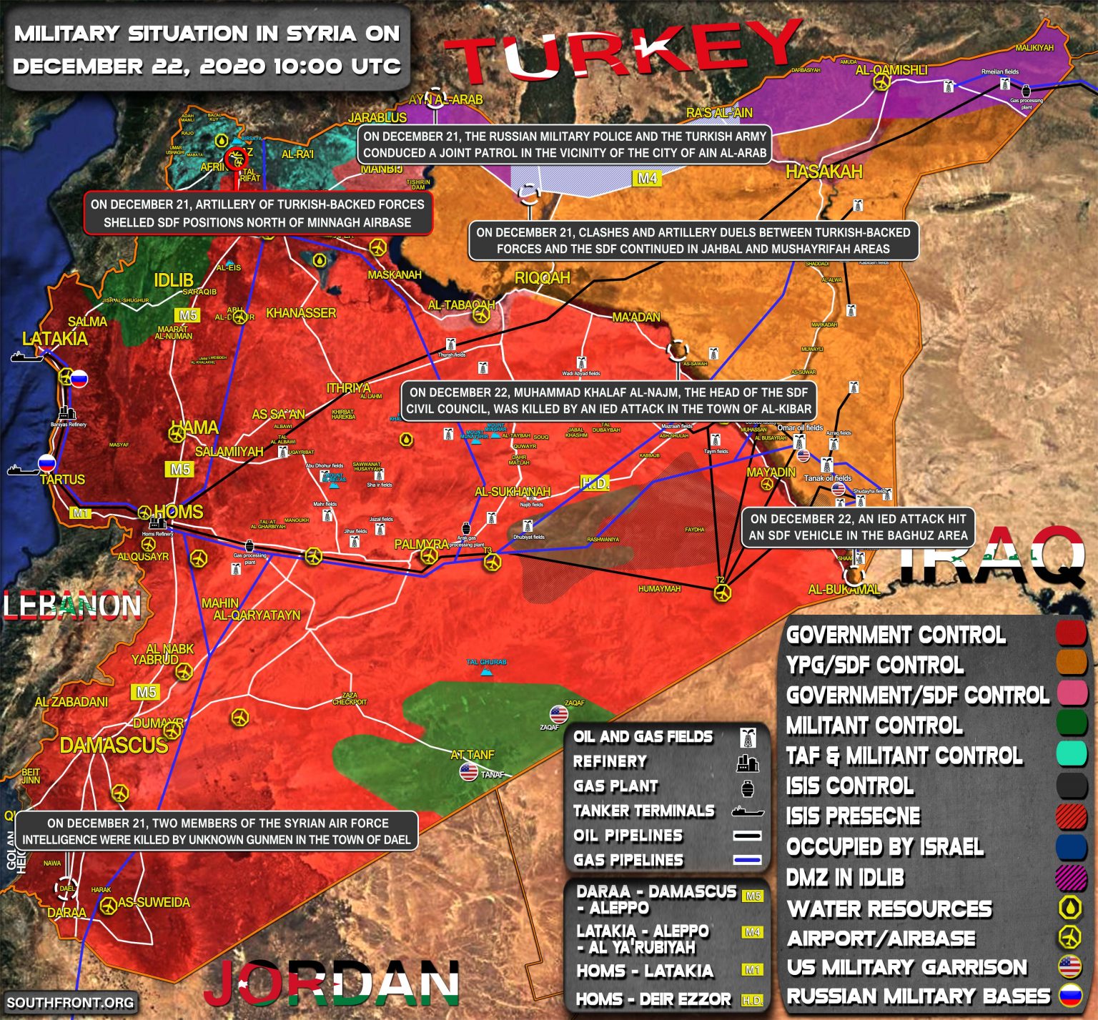 22. decembra bol pri útoku IED v meste al-Kibar zabitý šéf občianskej rady Sýrskych demokratických síl (SDF) Muhammad Khalaf al-Najm;