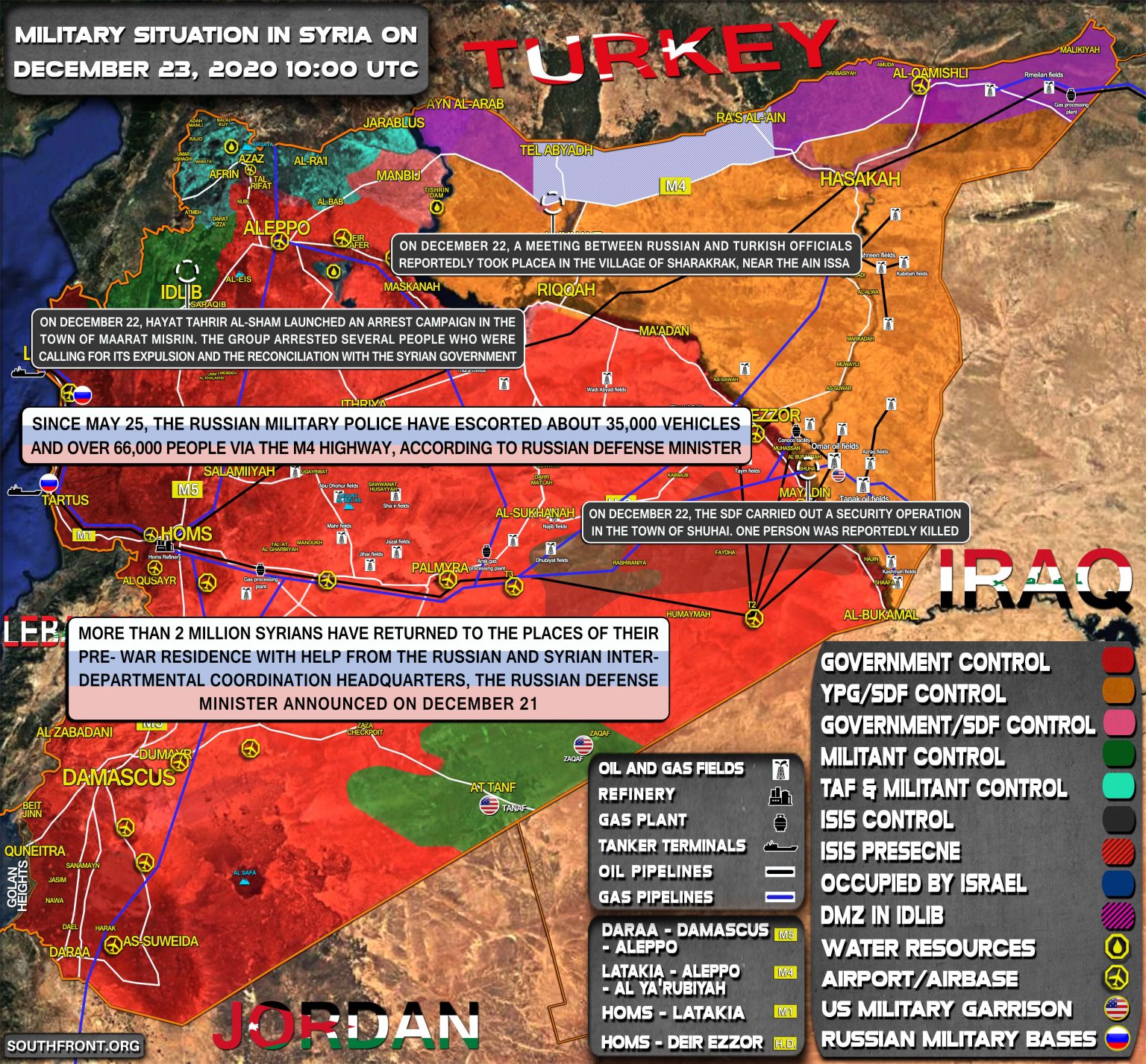 Viac ako 2 milióny Sýrčanov sa vrátili na miesta svojho predvojnového pobytu s pomocou ruského a sýrskeho medzirezortného koordinačného veliteľstva, oznámil ruský minister obrany 21. decembra;