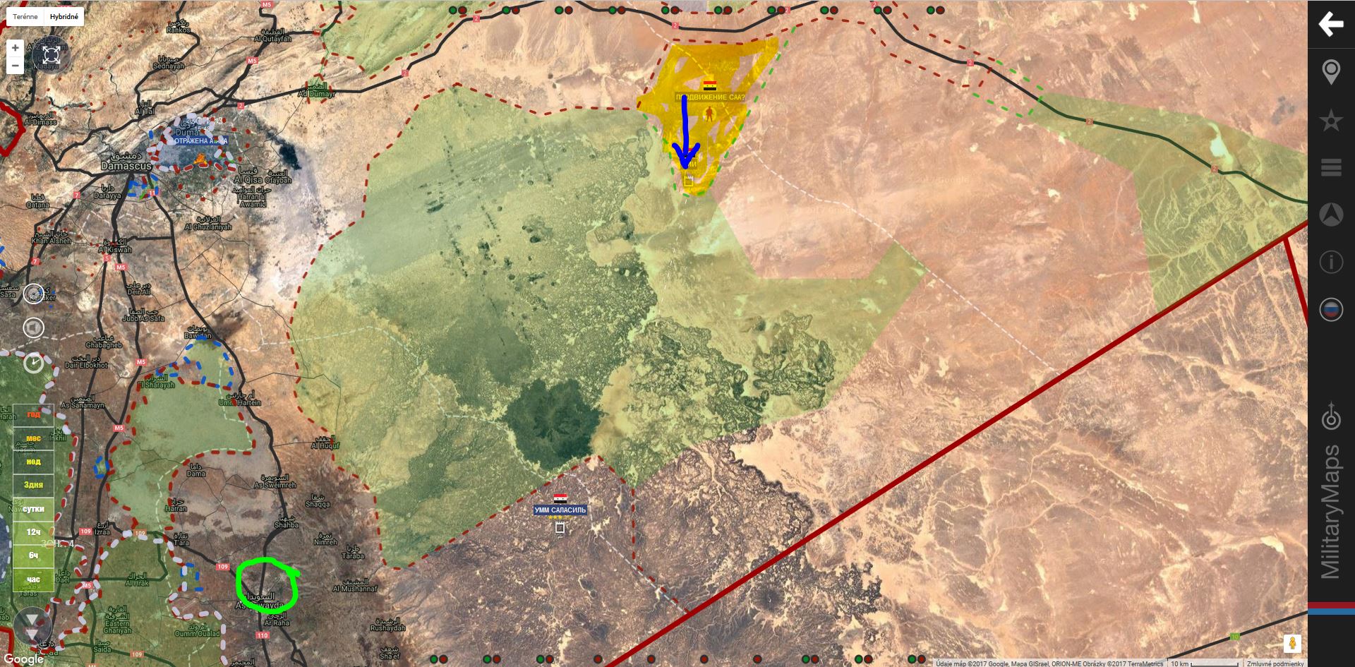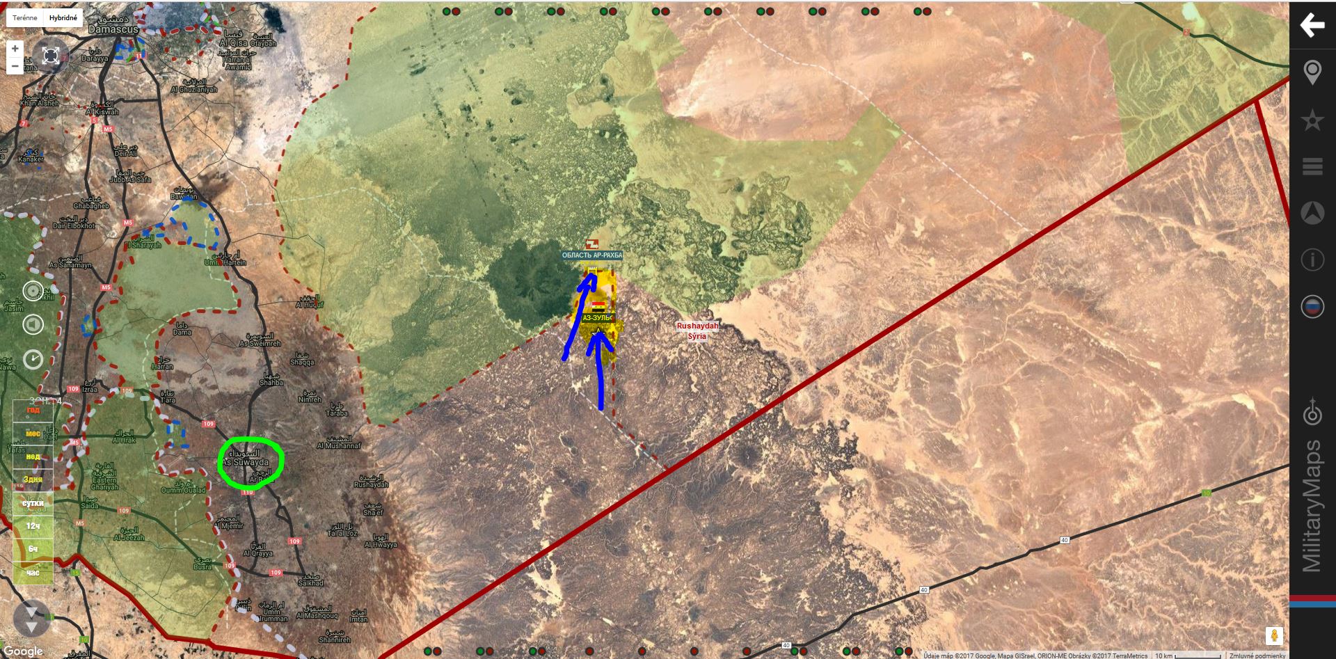 Vojenské zdroje dobře informované izraelské agentury DEBKAfile uvádí, že v době, kdy byl americký prezident druhý den na návštěvě metropole Saúdské Arábie, dorazil do syrského Suweidu ruský kontingent tvořený výsadkáři a speciálními jednotkami zvanými «specnaz». Tento kontingent se spojil se syrskými vládními jednotkami, s «Hisballáhem» a dalšími proíránskými spojenci, kteří jsou už připraveni čelit elitním jednotkám USA, Jordánska, Velké Británie a Norska, aby získali kontrolu nad 600 strategickými kilometry syrsko – irácké hranice a jejími klíčovými hraničními přechody.