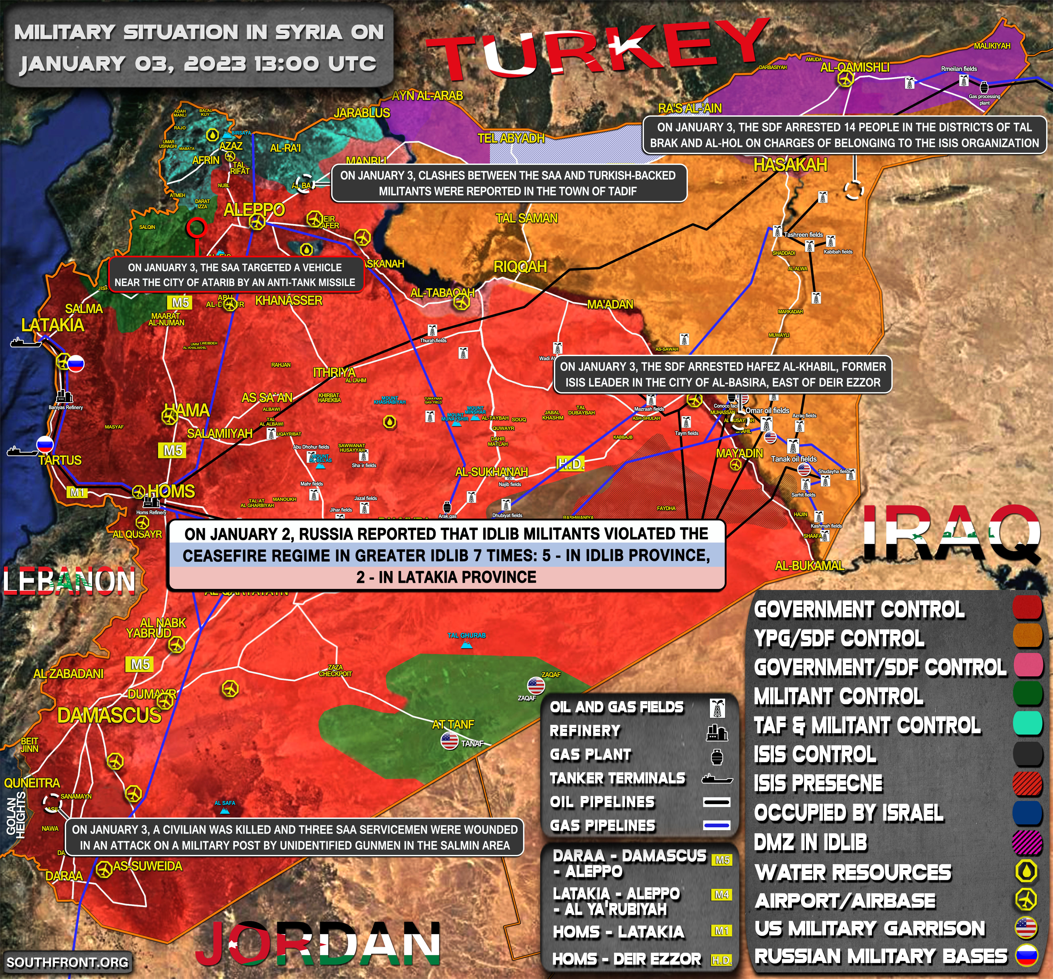 3. januára bol zabitý civilista a traja príslušníci SAA boli zranení pri útoku na vojenské stanovište neidentifikovanými ozbrojencami v oblasti Salmin;