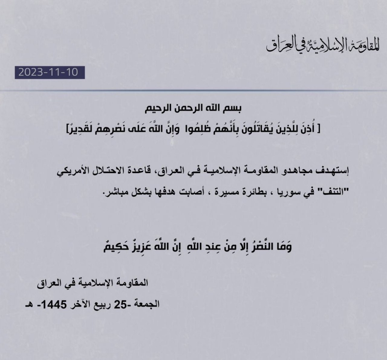"Bojovníci Islamského odporu v Iraku podnikli útok bezpilotným lietadlom na americkú okupačnú základňu Green Village v hĺbke Sýrie," uvádza sa v jej vyhlásení.