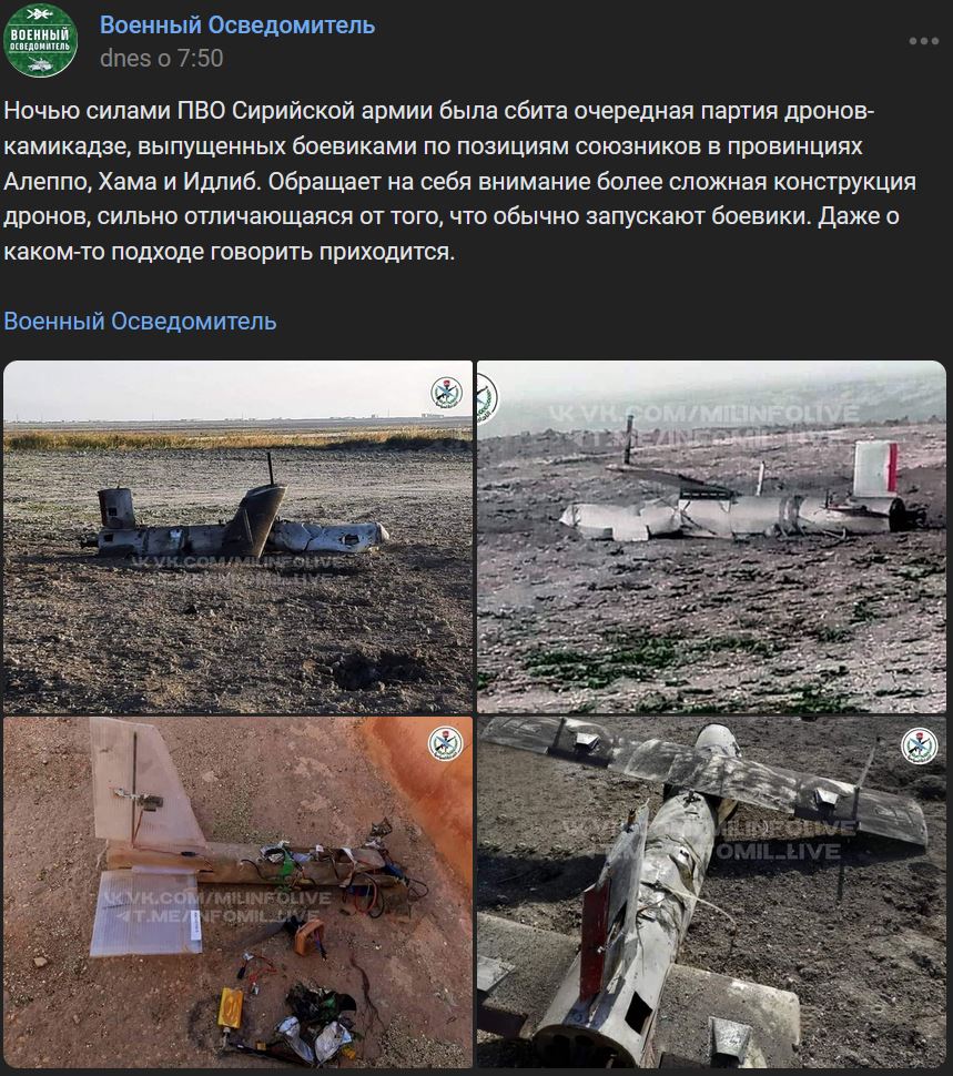 V noci z pondelka 13.11.2023 na utorok 14.11.2023 sýrske armádne sily PVO zostrelili ďalšiu sériu kamikadze BPLA, ktoré militanti vyslali na spojenecké pozície v provinciách Aleppo, Hamá a Idlib. Do popredia vystupuje sofistikovanejší dizajn dronov, ktorý sa veľmi líši od toho, čo militanti zvyčajne vypúšťajú.
