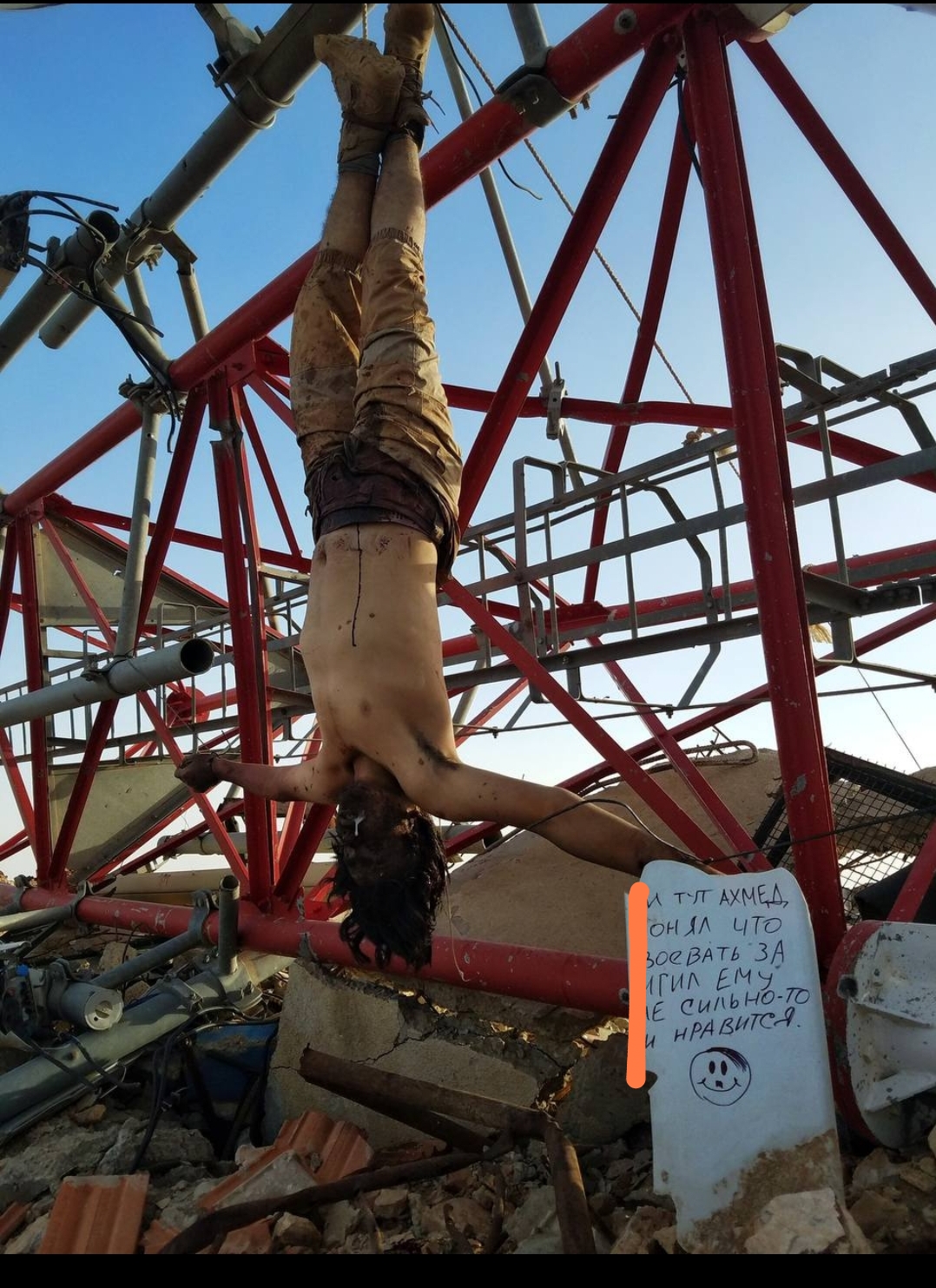 Zoznámte sa s naším sýrskym priateľom Ahmedom zo zakázanej organizácie ISIS. Stal sa novoročnou(rok neznamy) dekoráciou na televíznej veži v meste Homs.
