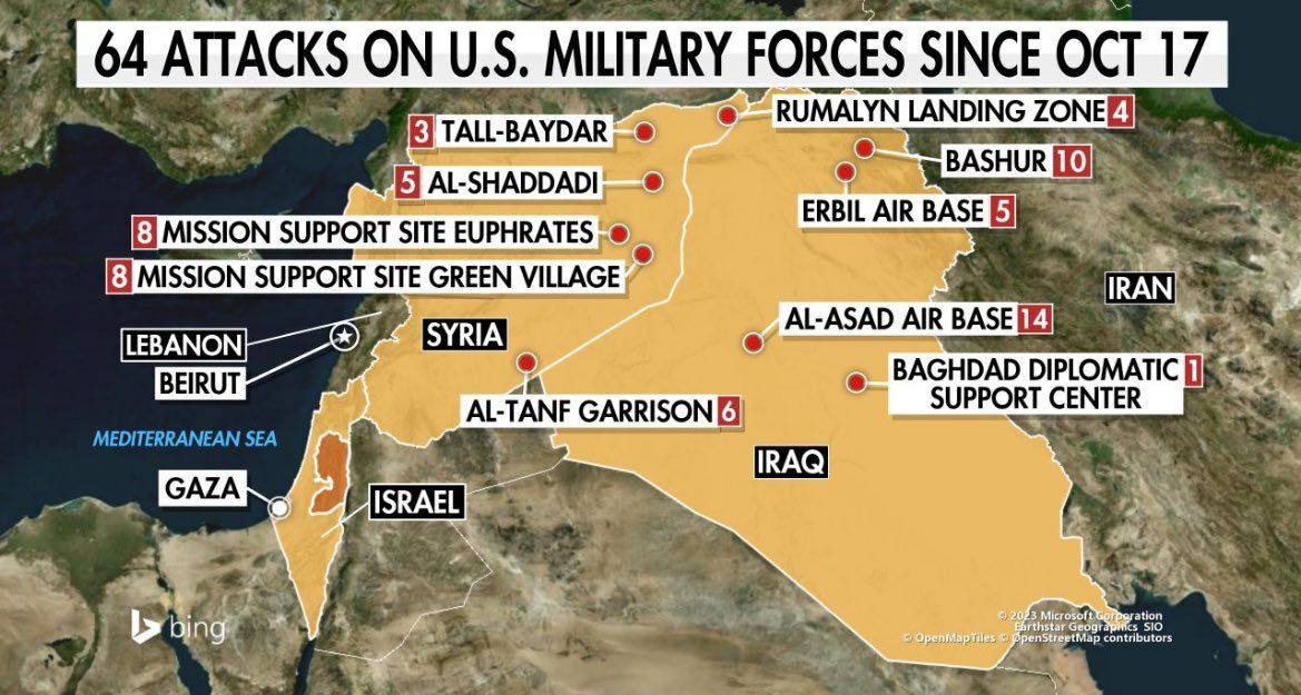Od 17. října došlo k 64 útokům na americké základny v Sýrii a Iráku, přičemž nedošlo k žádným lidským obětem.