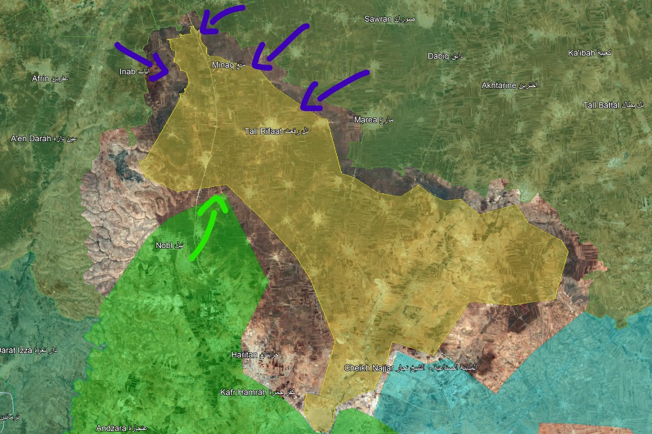 Objevují se prohlášení i záběry potvrzující přítomnost ozbrojenců v Kafině. Na webu se objevují zprávy o tom, že proturecké milice obsadily šíitský Nubbol a Al-Zahru, jakož i kurdský kanton Tell Rif'at. „Syrské demokratické síly“ se postupně vzdávají pozic, zatímco HTS nabídla Kurdům koridor pro stažení jednotek v Zaefratieh.
