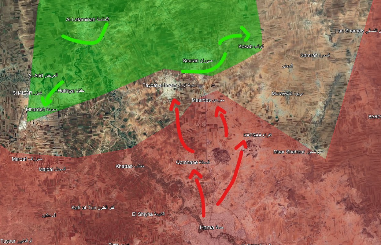 Syrská armáda (SAA) vyslala významné posily do města Hamá, k jehož severnímu okraji se včera přiblížili ozbrojenci. Ve vesnicích severně od Hamá probíhaly boje celou noc. V důsledku toho SAA znovu dobyla několik vesnic. Na druhé straně se teroristé HTS stáhli ze severu Hamá a připravují se na obranu rozšířením svých boků.