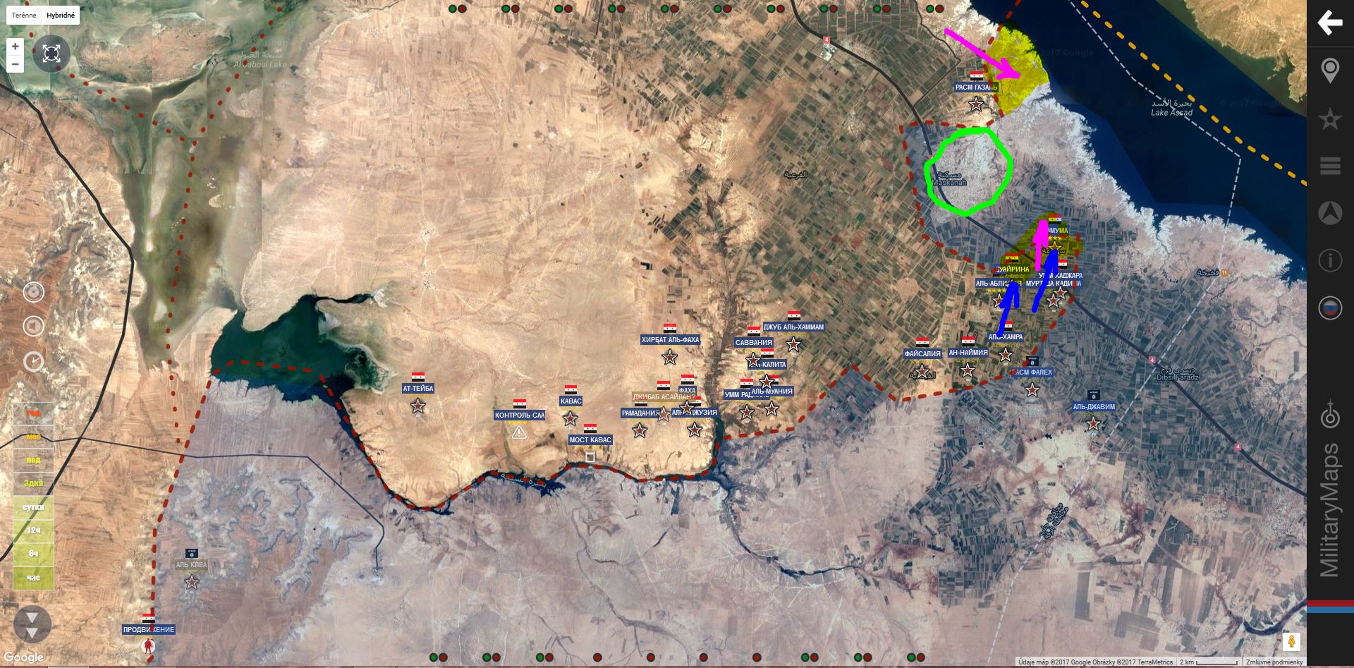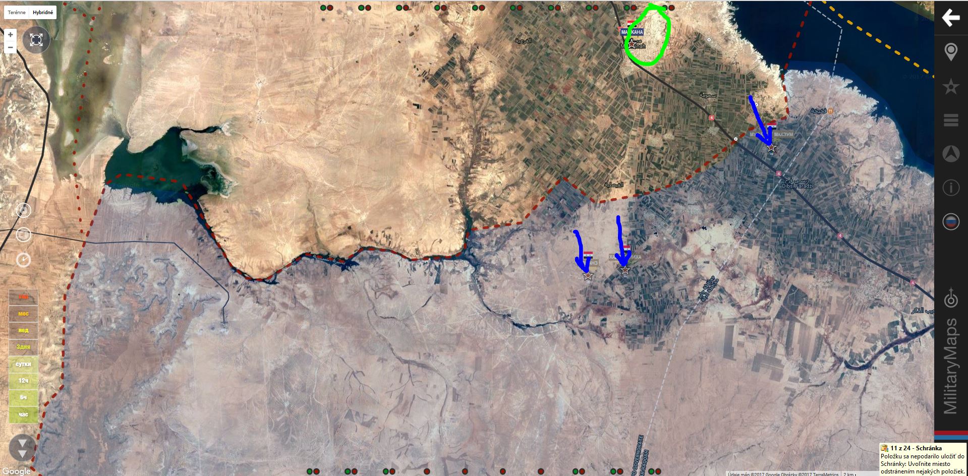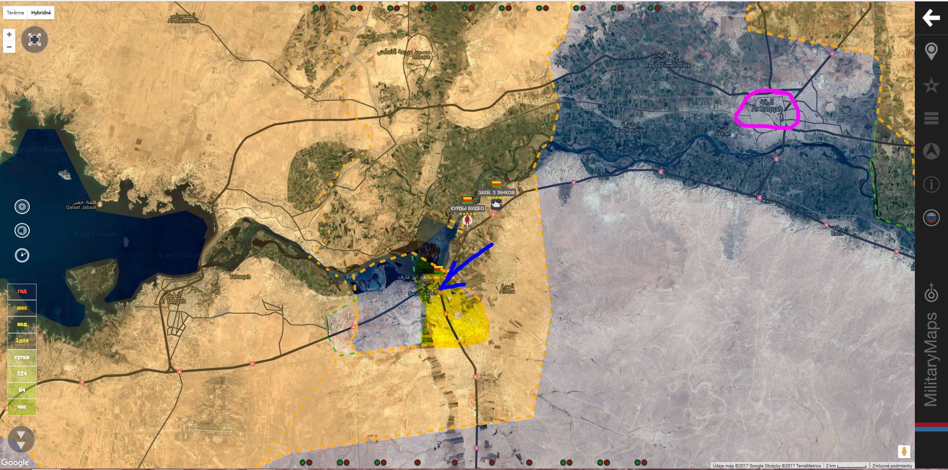 Maskanah. Podľa Militarymaps ešte obkľúčenie hotové nie je, SAA+ len preťala cestu na Rakká. SAA+ získala zo severu Rasm Ghazal. Fajsaliu, Umm Rajal, Al Namiju na juhu.