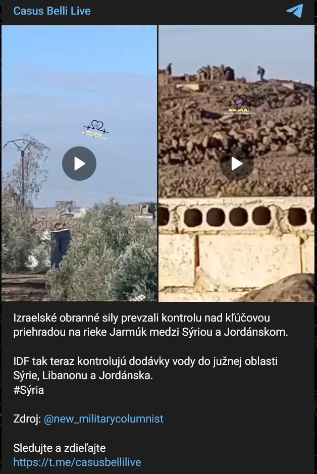 Izraelské obranné sily prevzali kontrolu nad kľúčovou priehradou na rieke Jarmúk medzi Sýriou a Jordánskom. IDF tak teraz kontrolujú dodávky vody do južnej oblasti Sýrie, Libanonu a Jordánska.