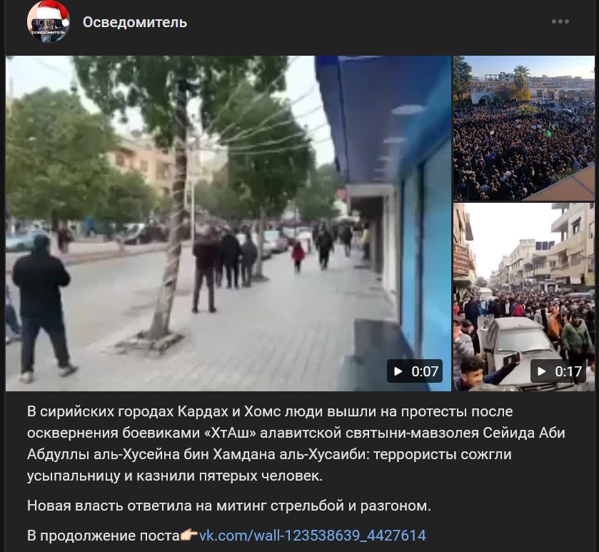 V sýrskych mestách Qardaha a Homs ľudia protestovali po znesvätení alavitskej svätyne Seyyida Abi Abdullaha al-Husseina bin Hamdana al-Husaybiho militantmi ChtAš (ХтАш): teroristi hrobku spálili a 5 ľudí popravili.
