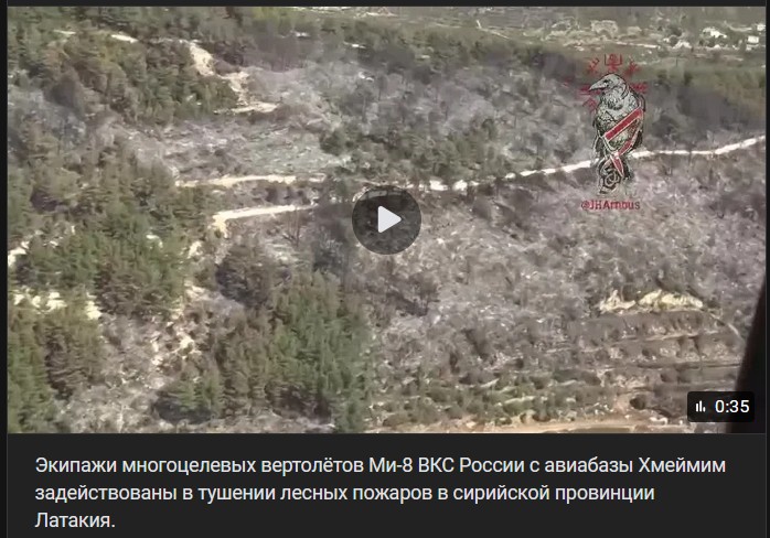 Posádky viacúčelových vrtuľníkov rodiny Miľ Mi-8 (Ми-8) VKS Ruska z leteckej základne Chmeimim sa podieľajú na hasení lesných požiarov v sýrskej provincii Latakia.