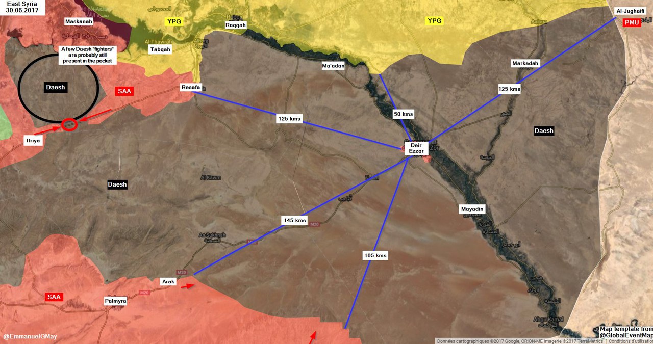 Kolik km až k Deir ez-Zor, syrská a irácká vojska, stejně tak íránská a Kurdi.