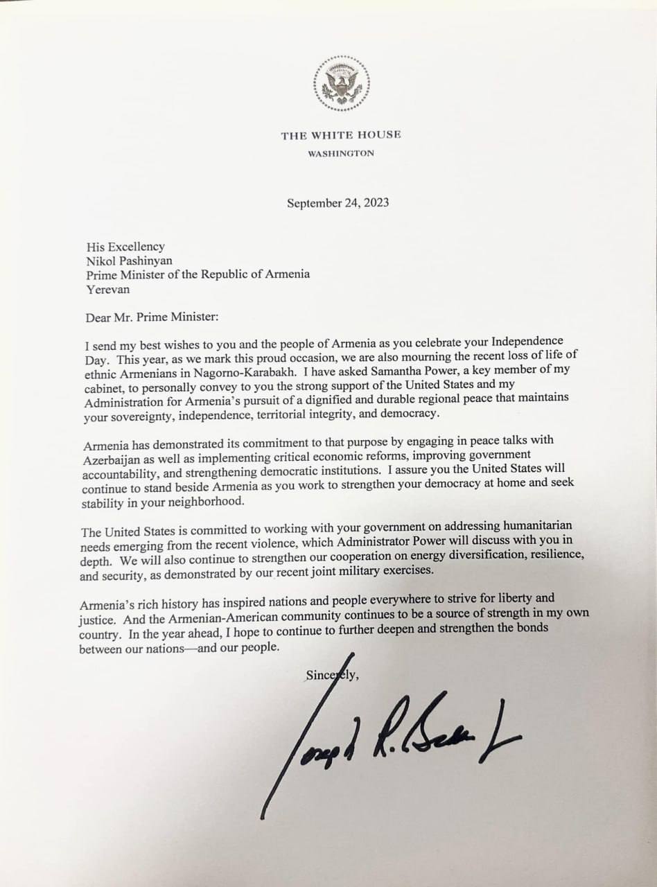 Americký prezident Joe Biden zaslal arménskému premiérovi Nikolu Pašinjanovi dopis, v němž ujistil, že Washington a Jerevan budou i nadále posilovat bezpečnostní spolupráci. Informovala o tom tisková služba arménského kabinetu ministrů.