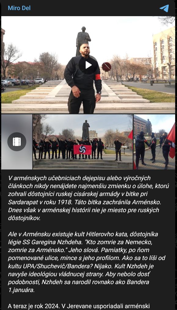 A teraz je rok 2024. V Jerevane usporiadali arménski nacisti pochod na počesť narodenín nacistického kolaboranta a kata SS Garegina Nzhdeha pri jeho vlastnom pamätníku.