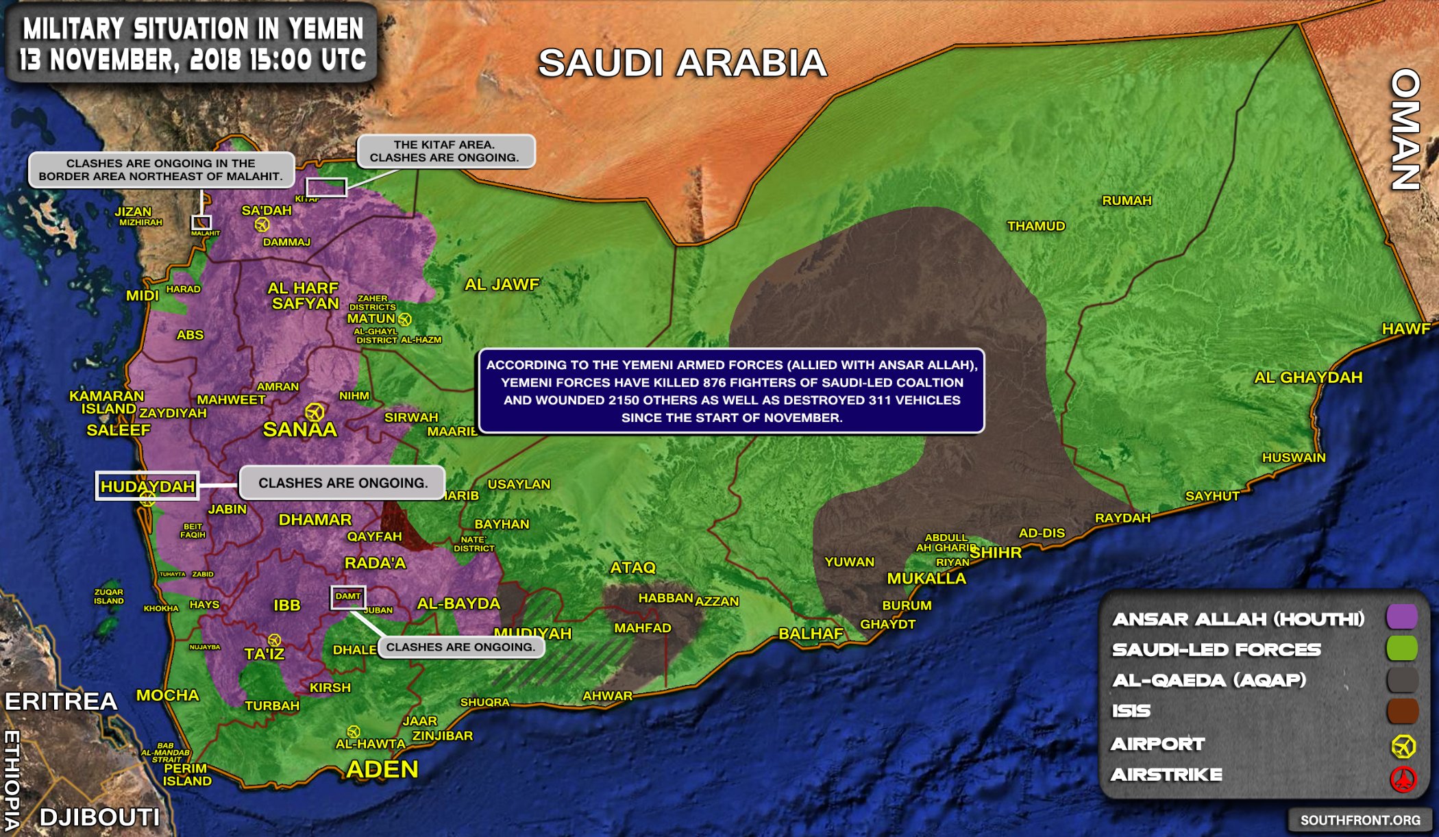 Podle mluvčího jemenských ozbrojených sil (spojenec s Ansar Alláh) Ansar Alláh a jeho spojenci zabil 876 bojovníků saudského koalice a zranili 2150 dalších, stejně jako zničili 311 vozidel od začátku listopadu.