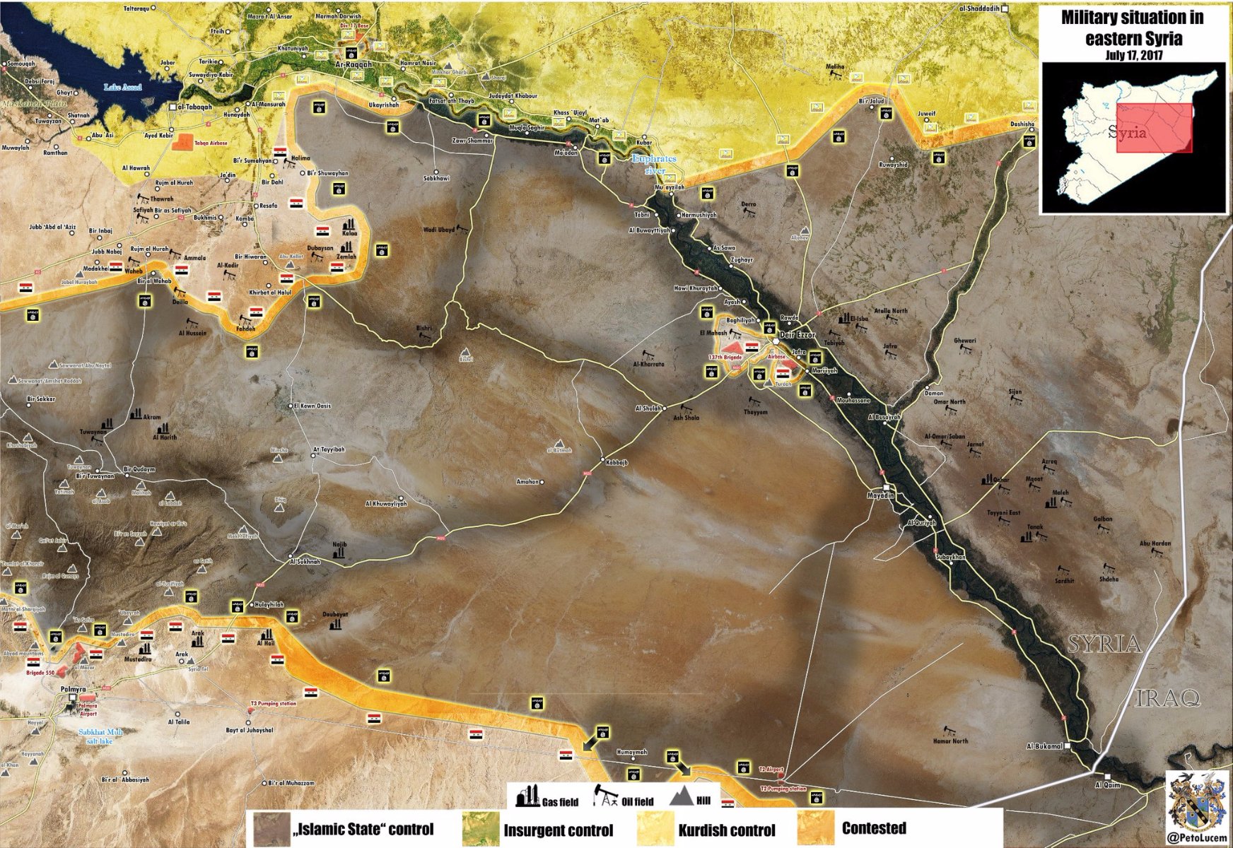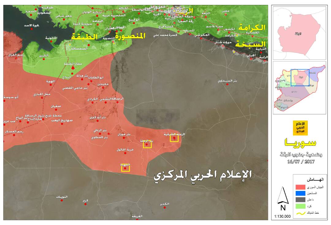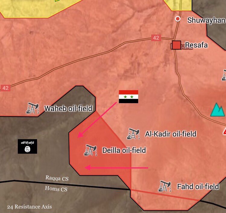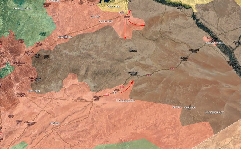 „Syrská arabská armáda vrátila kontrolu nad řadou vesnic na jihu provincie Rakka a na západě Dajr az-Zauru. Byla obnovena kontrola nad čtyřmi ropnými poli: Tabisan, Vachab, Fachad a Kabir," uvádí agentura RIA Novosti slova svého zdroje.