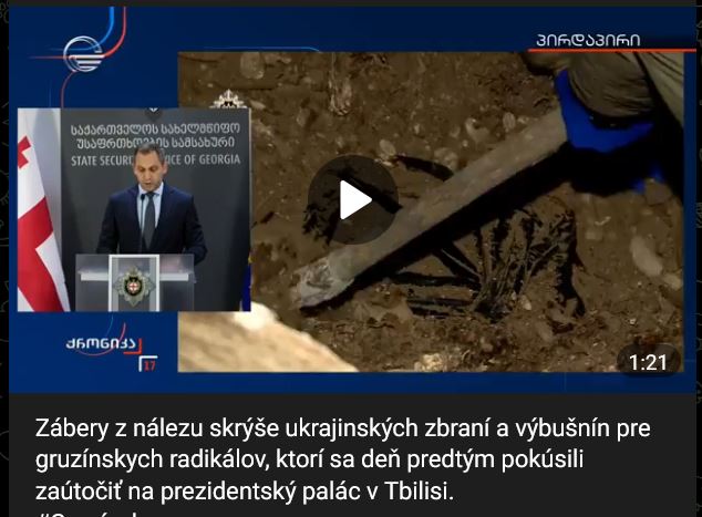Zábery z nálezu skrýše ukrajinských zbraní a výbušnín pre gruzínskych radikálov, ktorí sa deň predtým pokúsili zaútočiť na prezidentský palác v Tbilisi.