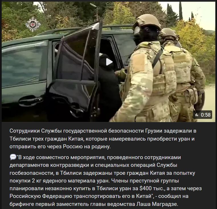 „V rámci spoločnej akcie, ktorú zorganizovali zamestnanci oddelení kontrarozviedky a špeciálnych operácií Štátnej bezpečnostnej služby, zadržali v Tbilisi 3 občanov Číny za pokus o nákup 2 kg jadrového materiálu - uránu. Členovia zločineckej skupiny plánovali nelegálne kúpiť v Tbilisi urán za 400-tisíc $ a potom ho cez Ruskú federáciu prepraviť do Číny,“ informoval na brífingu prvý zástupca šéfa úradu Laša Magradze.