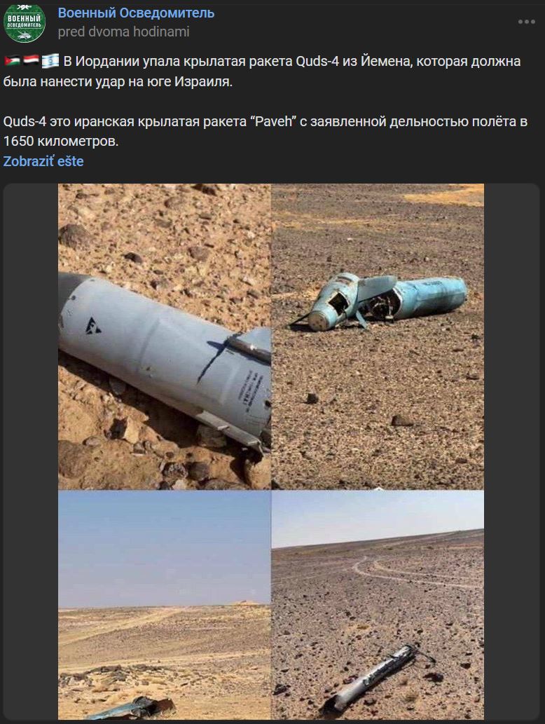 V Jordánsku spadla raketa Quds-4 z Jemenu, ktorá mala pravdepodobne zasiahnuť južný Izrael. Quds-4 je iránska raketa Paveh s deklarovaným doletom 1650 kilometrov.
