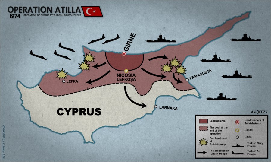 V červenci 1974 zaútočily turecké jednotky a obsadily 3 % rozlohy ostrova předtím, než byl vyhlášen klid zbraní. Následkem toho se řecká vojenská junta zhroutila a byla nahrazena demokratickou vládou. V srpnu 1974 další turecký postup vyústil v zabrání 40 % ostrova. Linie příměří ze srpna se stala nárazníkovou zónou OSN, které se říká „Zelená linie“.