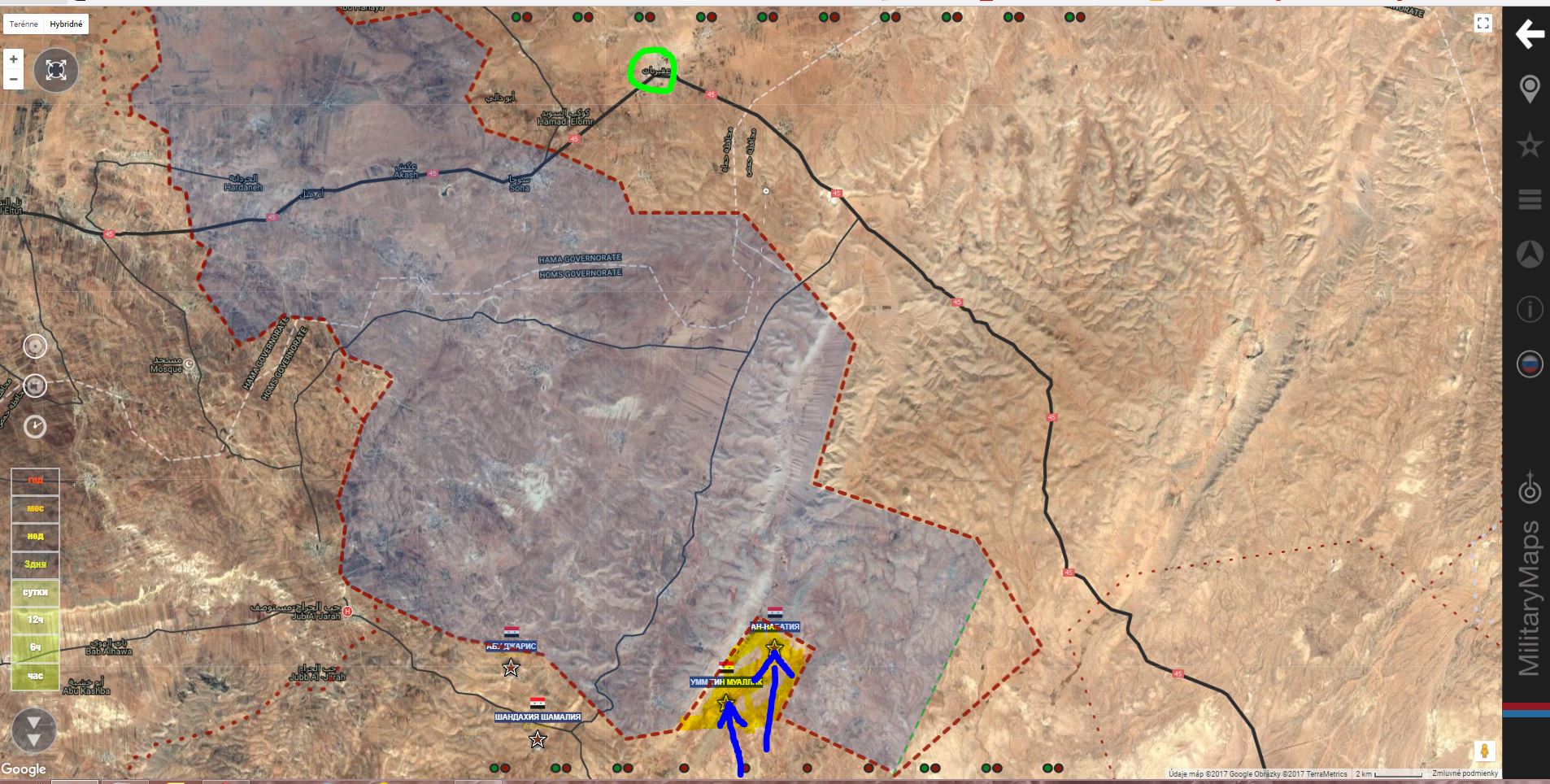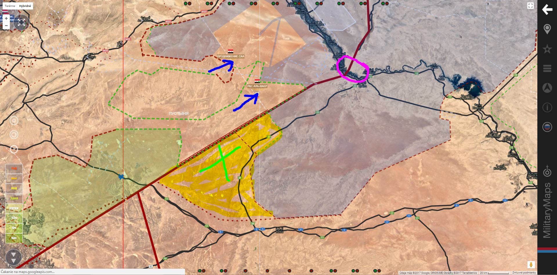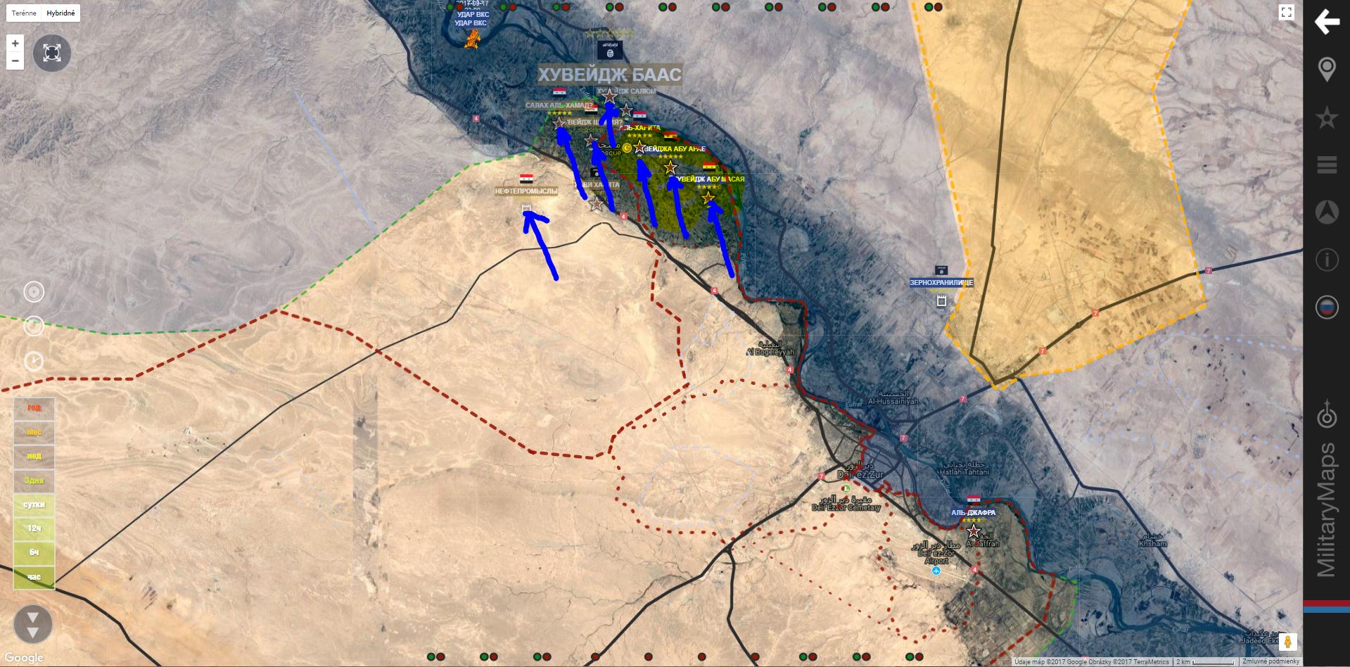 Deir Ez Zorr. Včerajší postup SAA+(‘Ayn Abu Jama’a, Hawayj Abu Masaa, Al-Kharetah, Hawysh Al-Shamiya, Mazra’a Hajj Hammoud, a Saleh Al-Hamad.). Vľavo sú ťažobné oblasti, sevrne sa dostala po Salah Al Hamad.