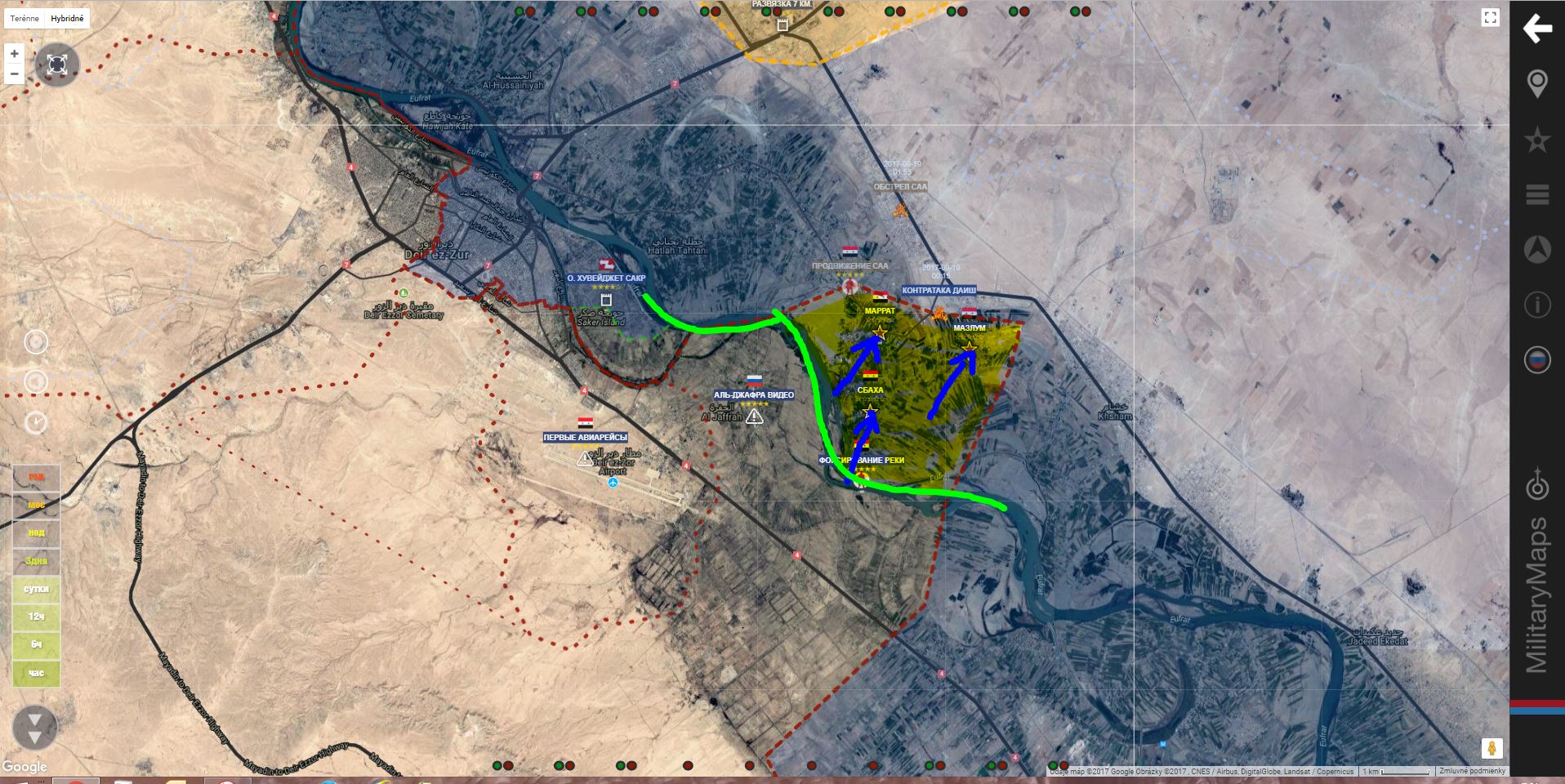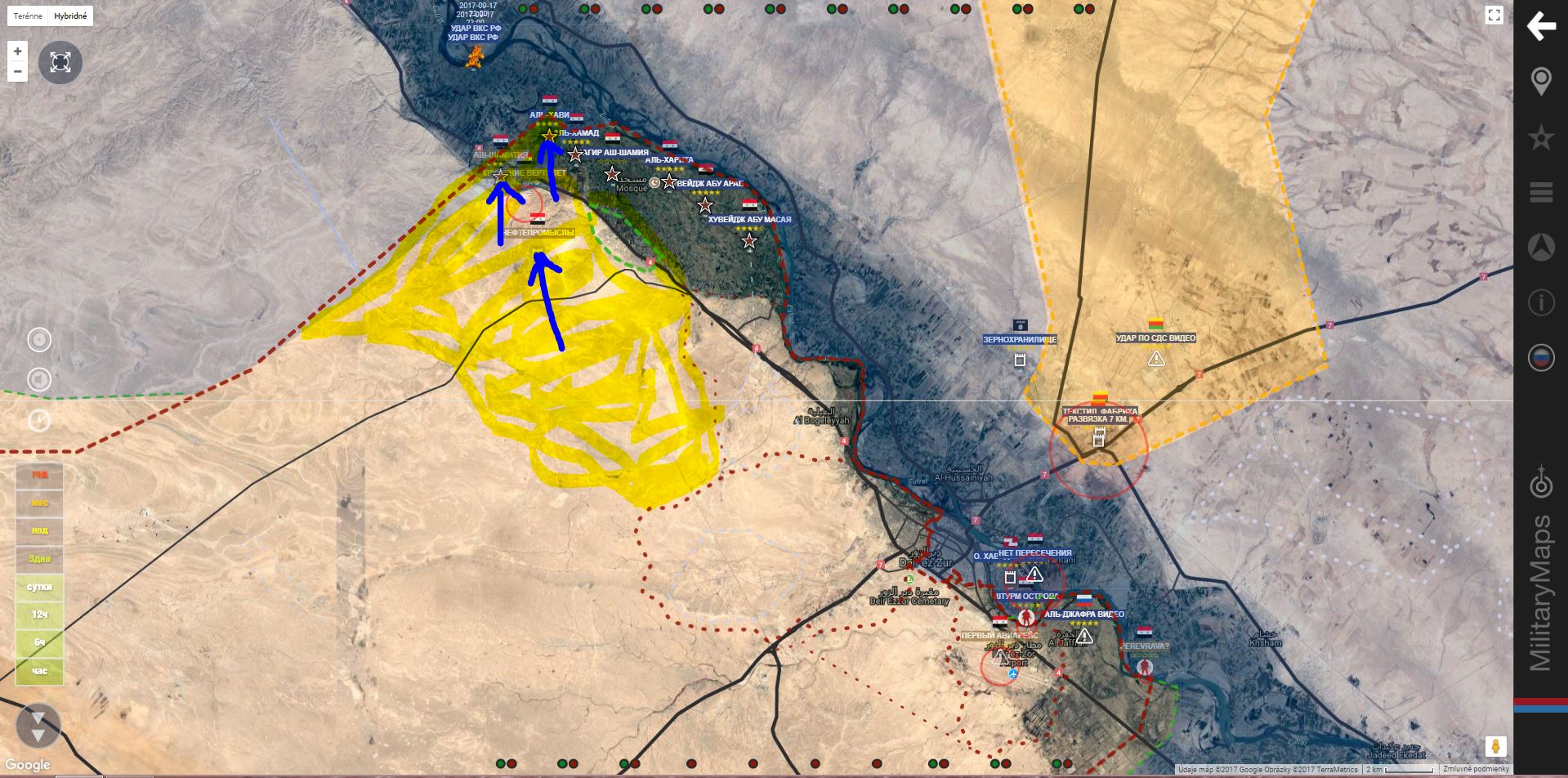 Ďalší postup SAA+ proti prúdu Eufratu k al-Hamad - Shumaytah - al-Hawi a Zaghir ShumaytahIgorT píše: ↑18 zář 2017, 08:11Deir Ez Zorr. Včerajší postup SAA+(‘Ayn Abu Jama’a, Hawayj Abu Masaa, Al-Kharetah, Hawysh Al-Shamiya, Mazra’a Hajj Hammoud, a Saleh Al-Hamad.). Vľavo sú ťažobné oblasti, severne sa dostala po Salah Al Hamad.