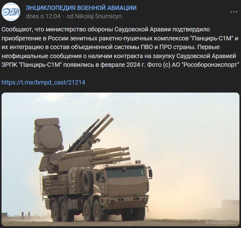 Saudskoarabské ministerstvo obrany údajne potvrdilo nákup protilietadlových raketových systémov Pancir-S1M (Панцирь-С1М) z Ruska a ich integráciu do jednotného systému PVO a PRO krajiny. Prvé neoficiálne správy o existencii zmluvy o nákupe systémov protivzdušnej obrany Pancir-S1M Saudskou Arábiou sa objavili v 02/ 2024.