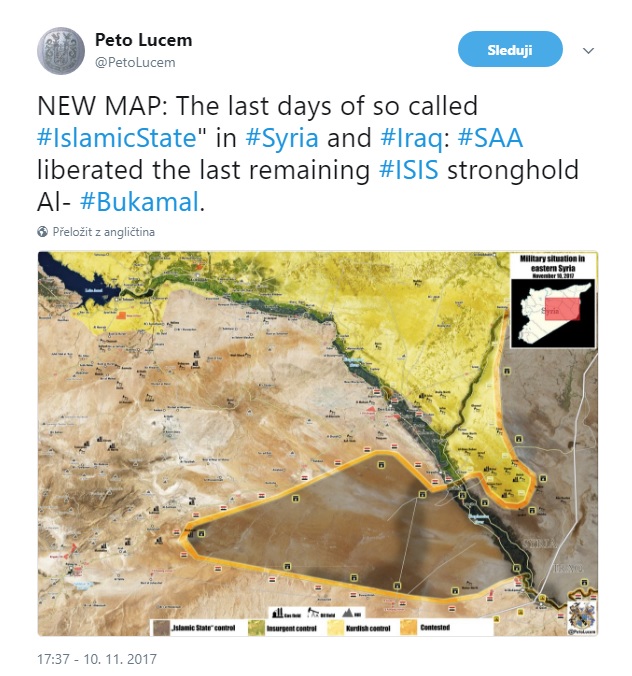https://www.novinky.cz/zahranicni/blizk ... amalu.htmlVůdce samozvaného Islámského státu (IS) abú Bakr Bagdádí byl spatřen v syrském Búkamálu, který byl dobyt v noci na čtvrtek. Uvedla to v pátek televize Al-Manar libanonského hnutí Hizballáh, jehož bojovníci se na dobývání města podíleli.