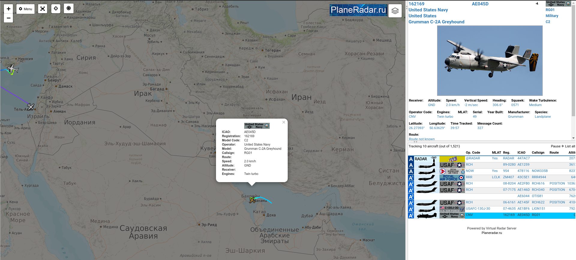 Přibližná pozice LL USS Abraham Lincoln (nebo Harry Truman?) v současnosti v Perském zálivu (je někde mezi Dauhá a Dubají) - z ní startující C-2A Greyhound a přistávající v Bahrajnu.