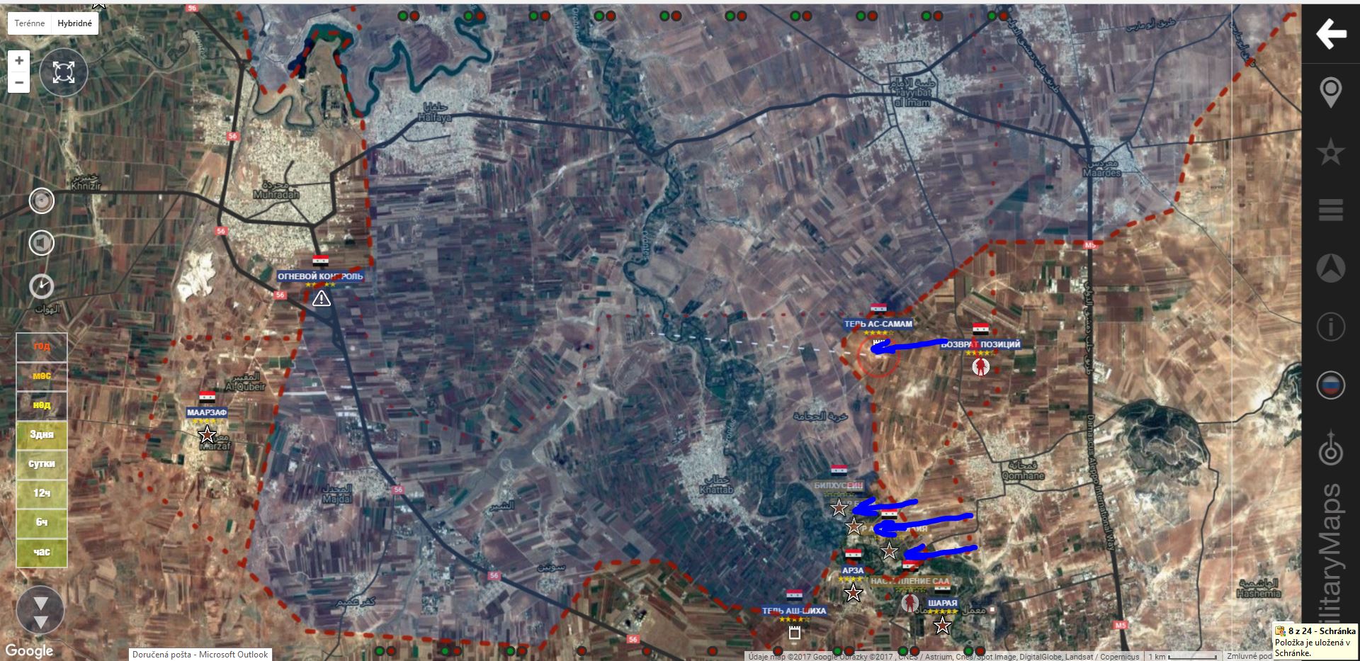Nová mapa. Severně od Hamá. Obce Arzeh, Zawr al Bala, Balahseen pod kontrolou SAA