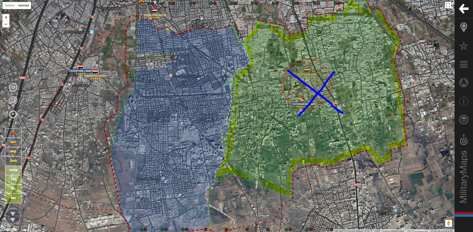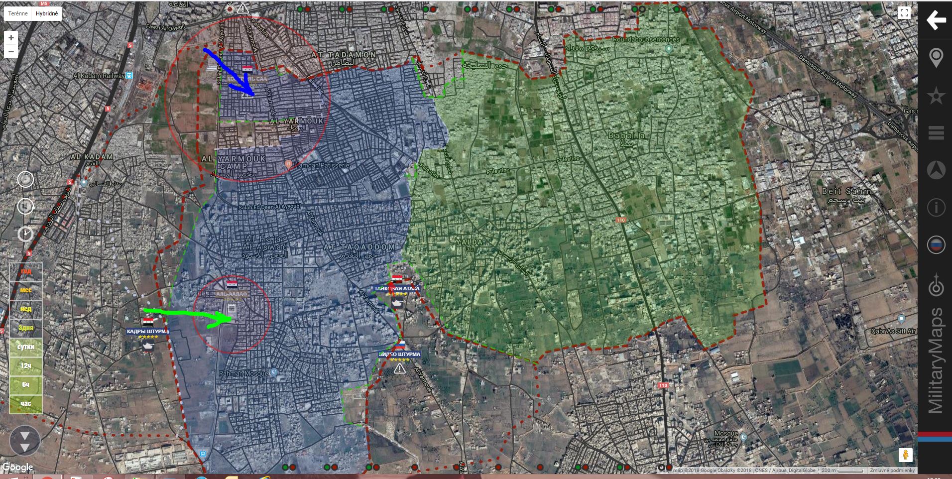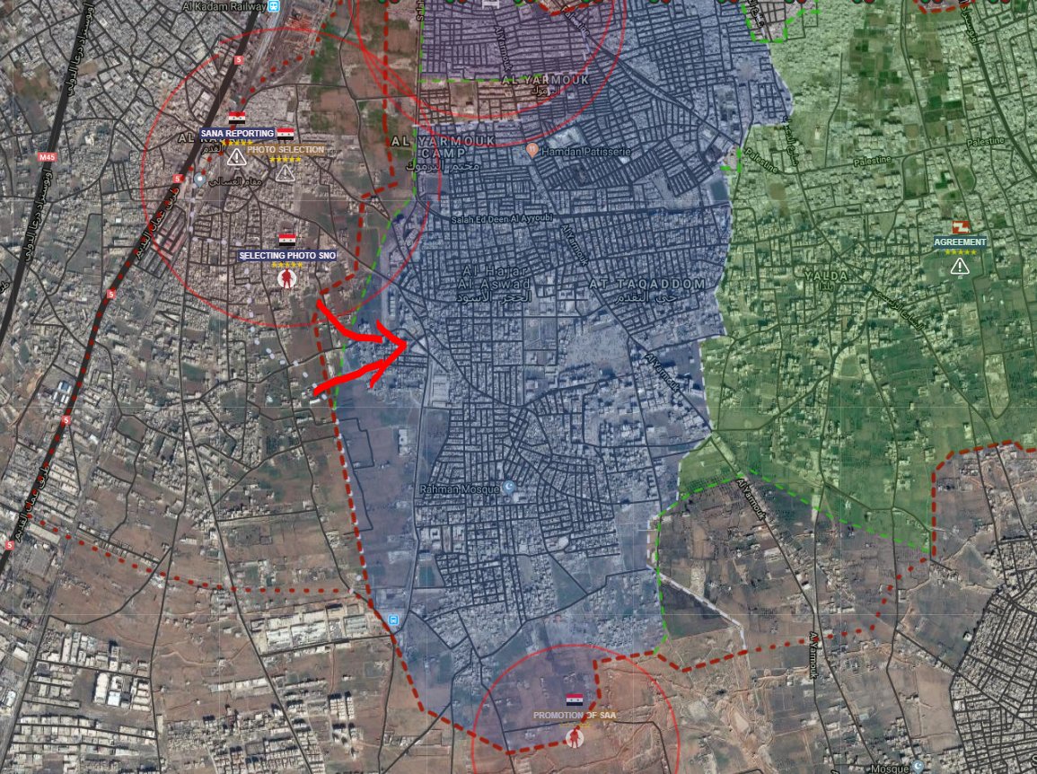 J. Damašek. SAA ustanovila kontrolu nad oblasťou v tábore Yarmuk, ktorú predtým kontrolovali militanti HTS po ich vývoze do Idlibu. V západnej časti kotla sa dostali po námestie al Aalaf.