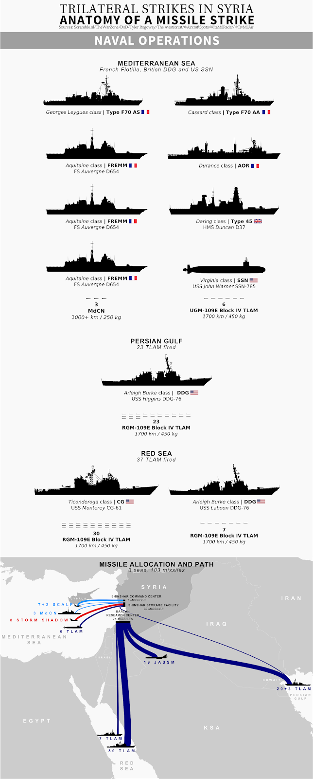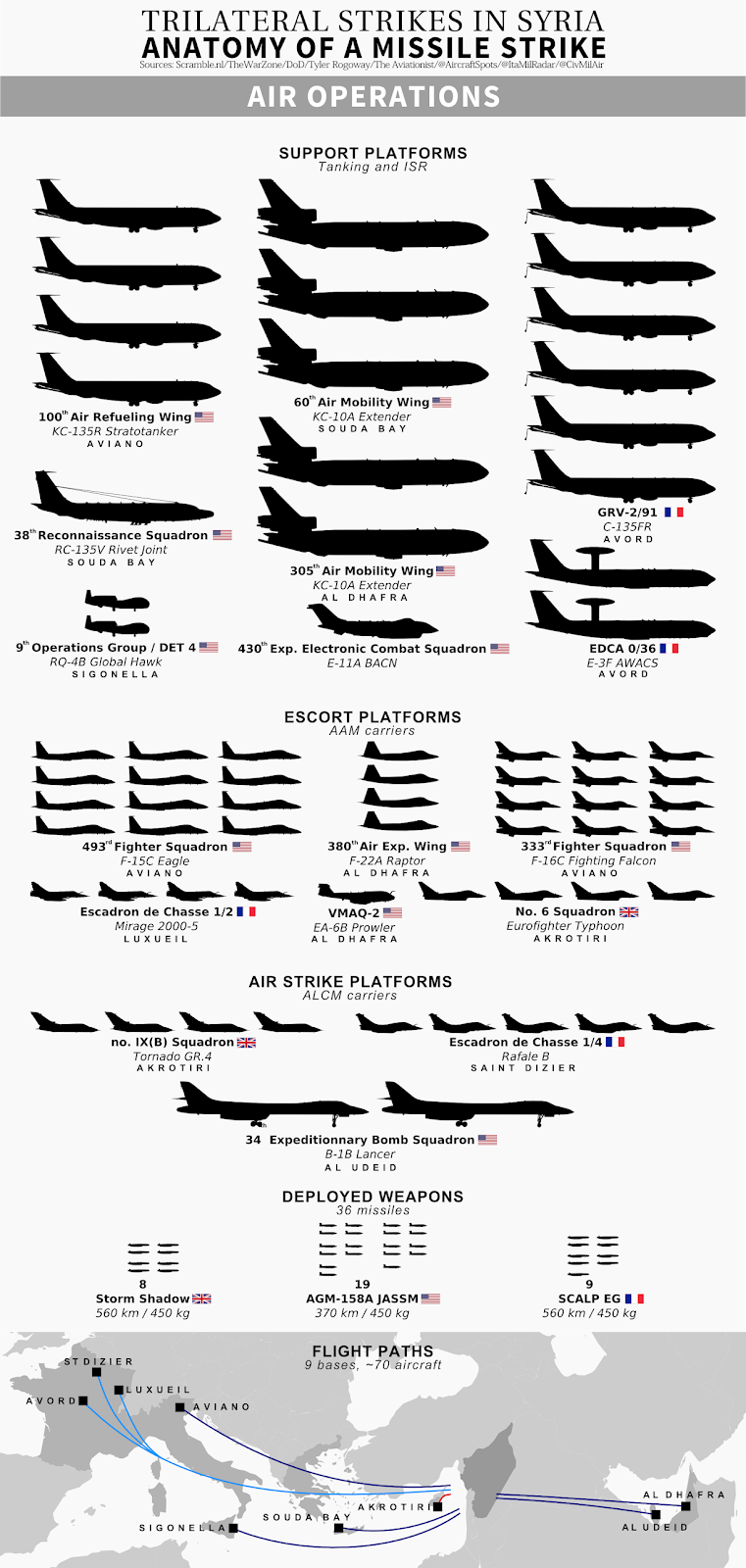 Útok 14.04.2018 na Sýriu, zostava lietadiel a striel podľa scramble.nl: