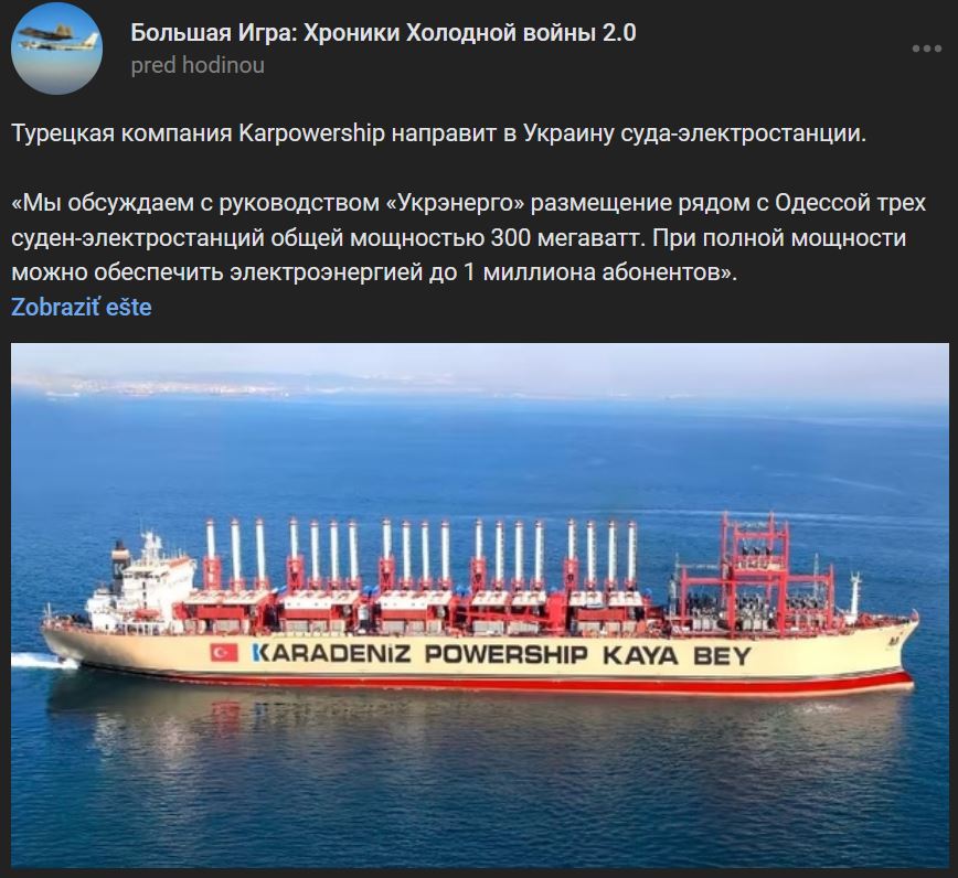 Turecká spoločnosť Karpowership pošle na Ukrajinu lode-elektrárne