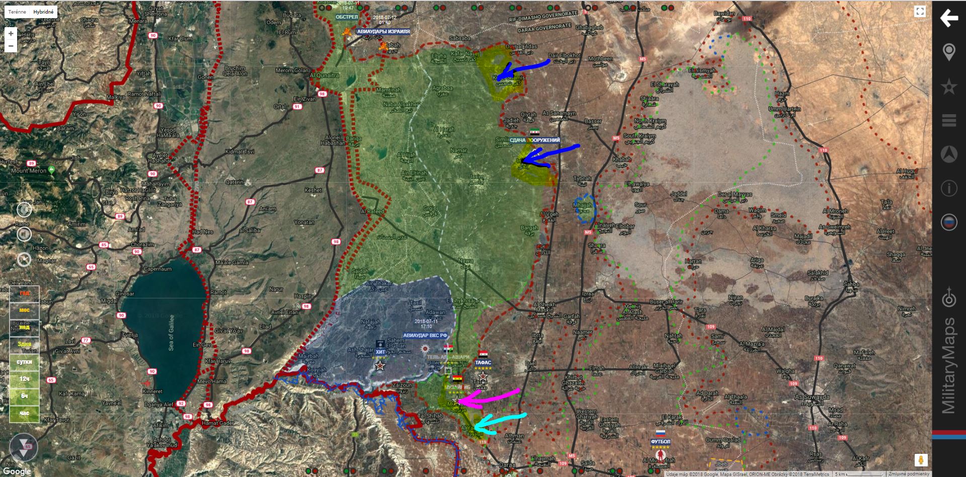 12. července 2018. Vojenská situace v Sýrii. Útoky syrské armády na militanty, letecké údery Izraele