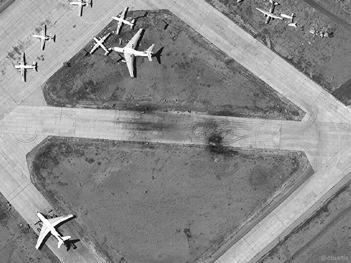 Tmavá skvrna v mezinárodním letišti Damašku, na stojánce nákladních IL - 76 VVS SAR(fotka datovaný 27 června 2018)