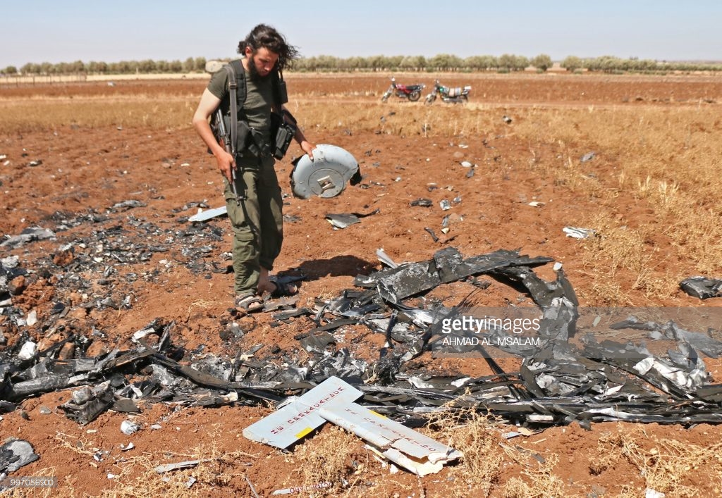 A rebel fighter walks near what purportedly are the remains of a Syrian regime drone that was shot down by Israel the day before, in a field near Barqah, a few dozen kilometres from the Israeli-occupied Golan Heights on July 12, 2018.