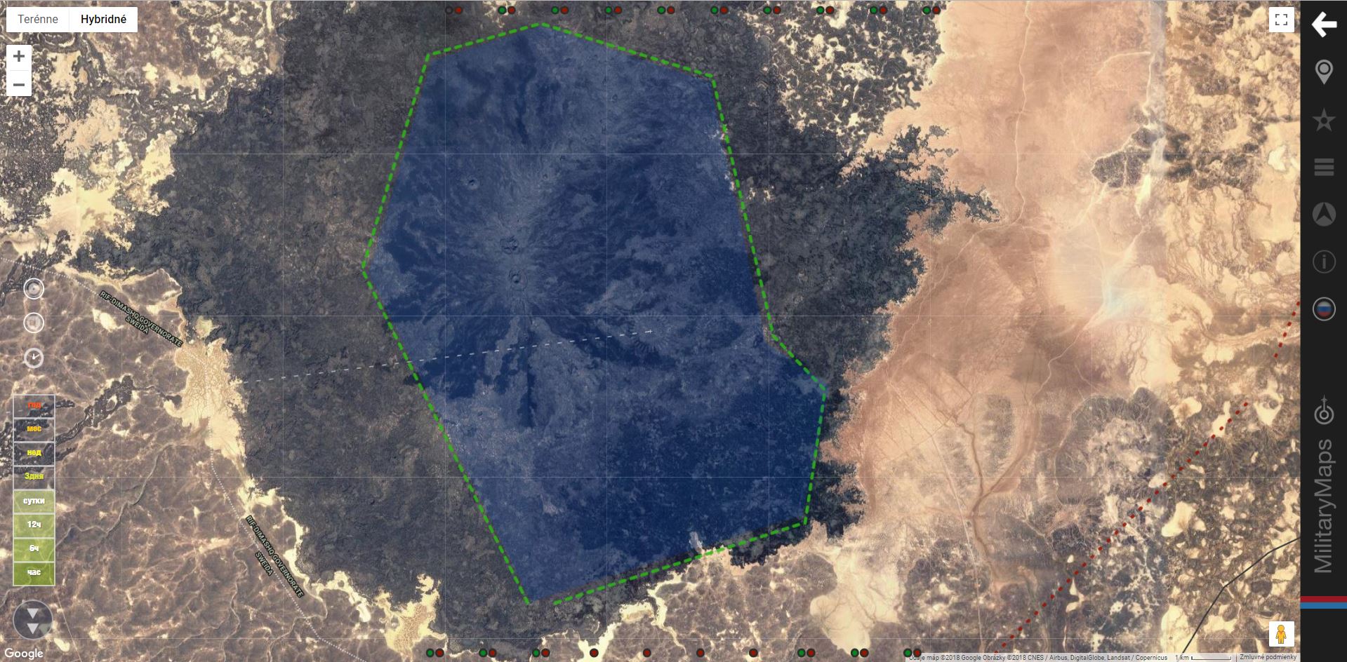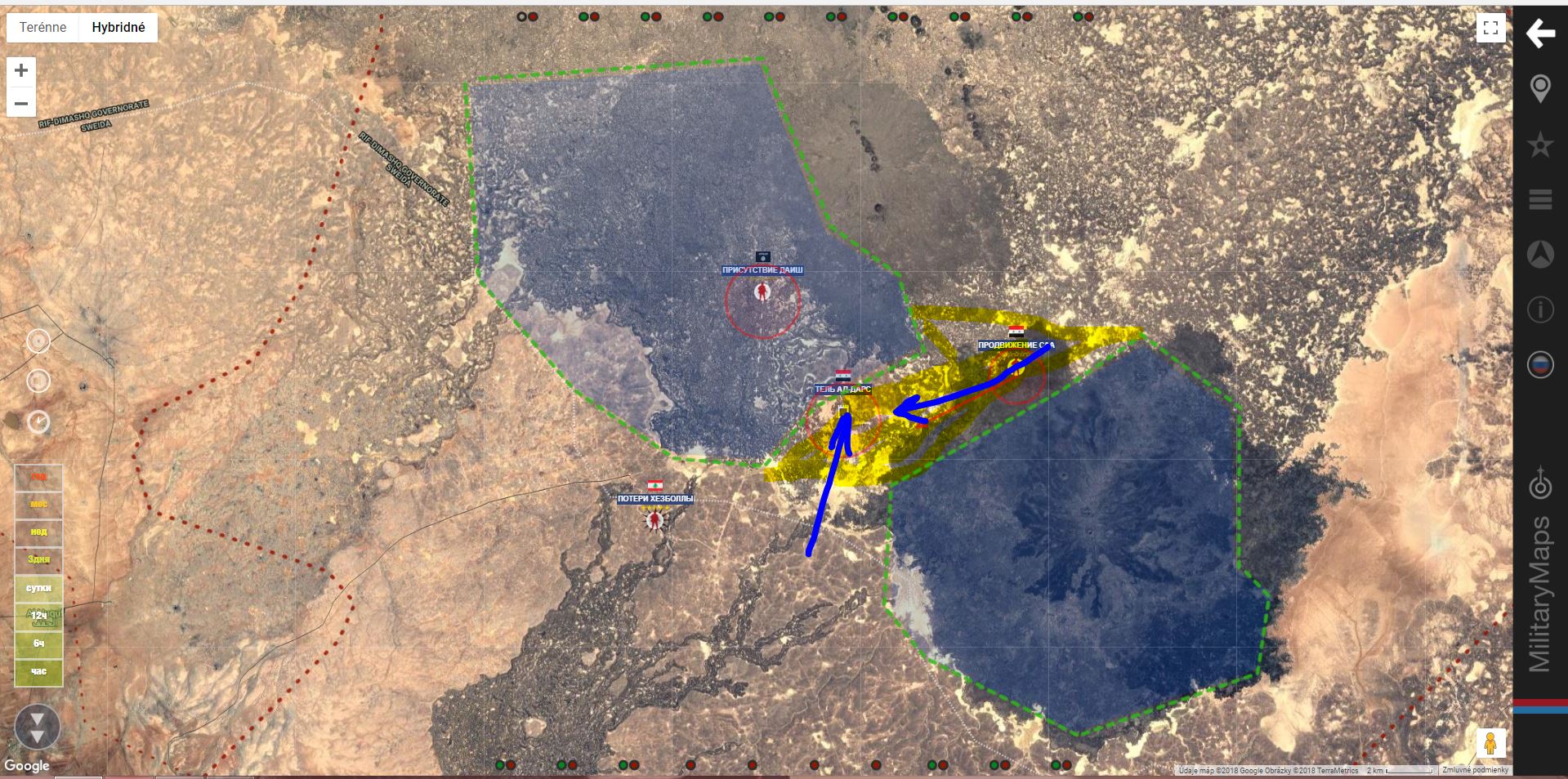 Letiska s ruskou leteckou technikou v Hmeymim (10 Su-24, 6 Su-34, 3 Su-35) a syrskou 20 km SV od Hama (Mil Mi-17) 13.8.2018
