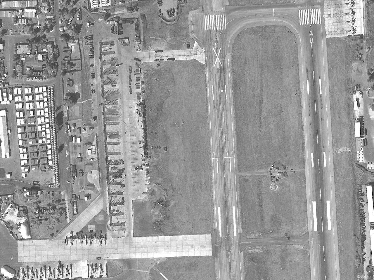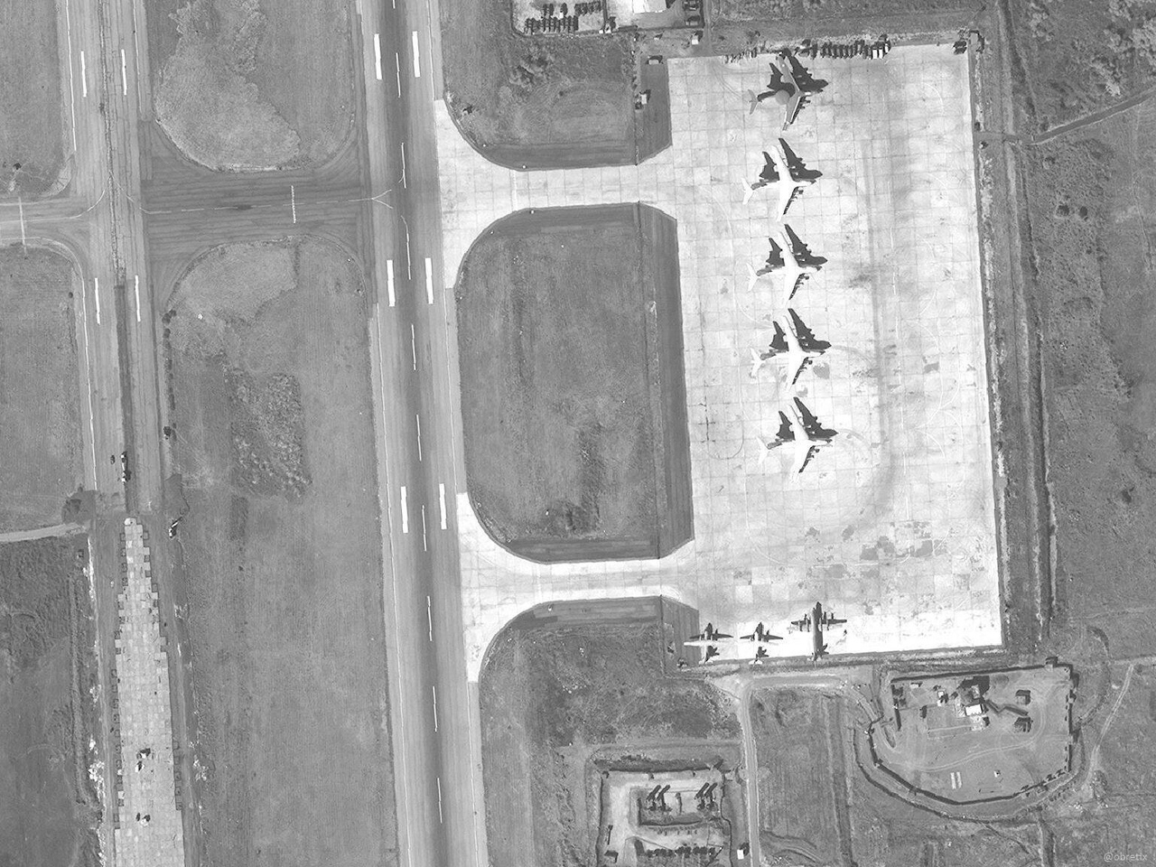 Dále se na snímku LZ nacházejí: čtyři stíhačky Su - 35, čtyři stíhací bombardéry Su - 34, devět frontových bombardérů Su - 24, letadlo DRLO A - 50, čtyři IL - 76, dva AN - 26 a jeden IL - 38
