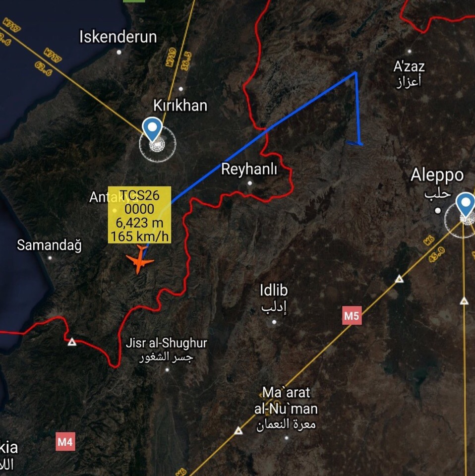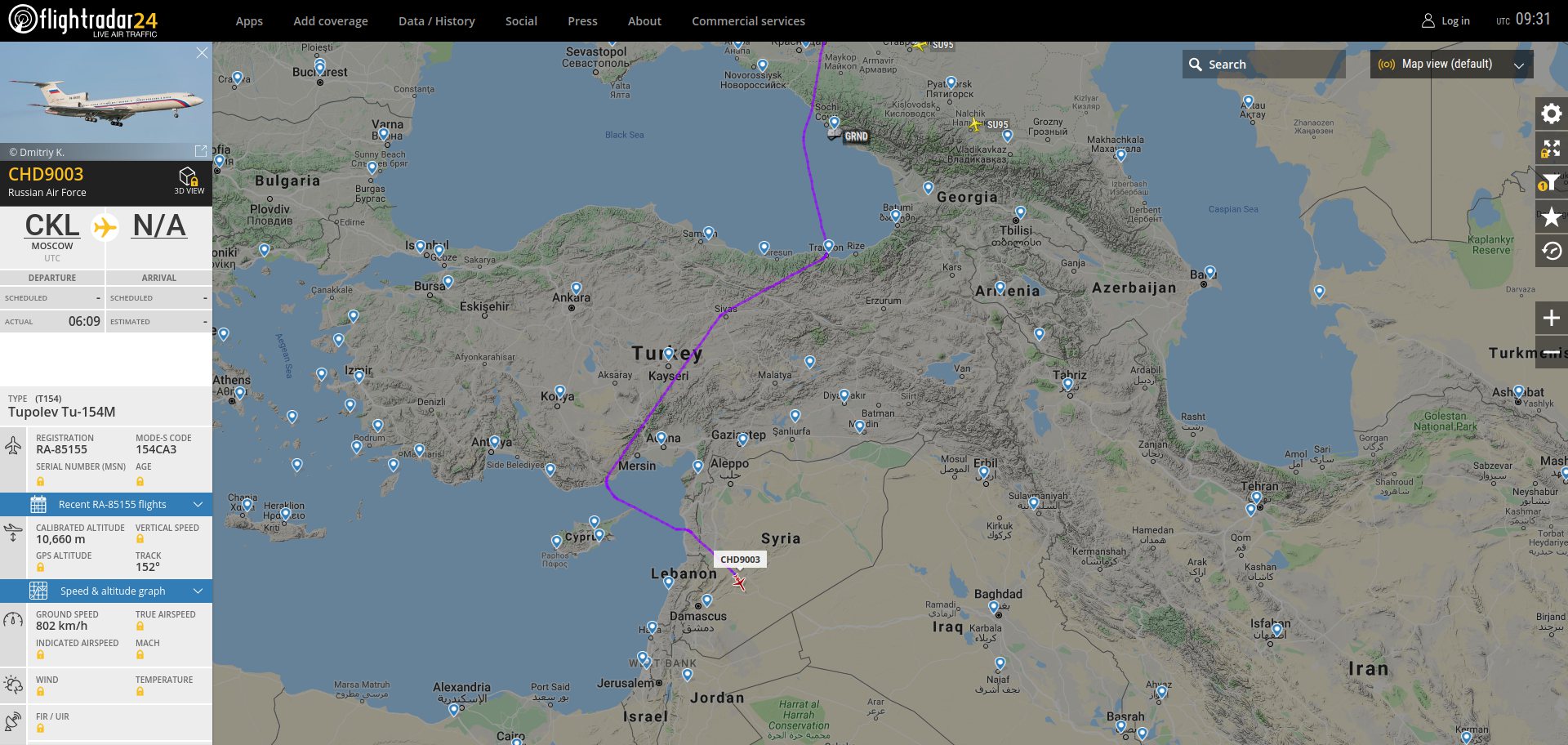 Tu-154 z Moskvy zvláštní trasou přes Turecko a neuznanou Severokyperskou tureckou republiku do Damašku