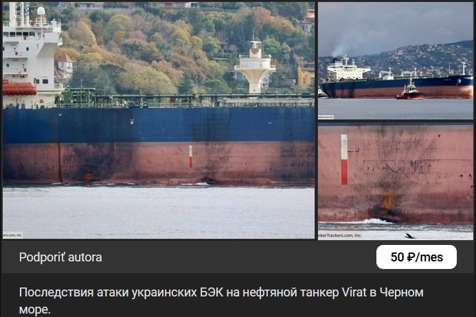 Zdroj https://vk.com/wall-123538639_4765293 z 15.12.2025Dôsledky útoku ukrajinských BEK na ropný tanker Virat v Čiernom mori
