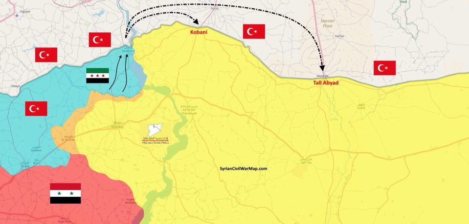 Džihádisté podporovaní Tureckem (FSA) se pohybují od přední linie Manbidž po Jerabulse. S největší pravděpodobností přijde útok na Kobani nebo Tel-Abyad