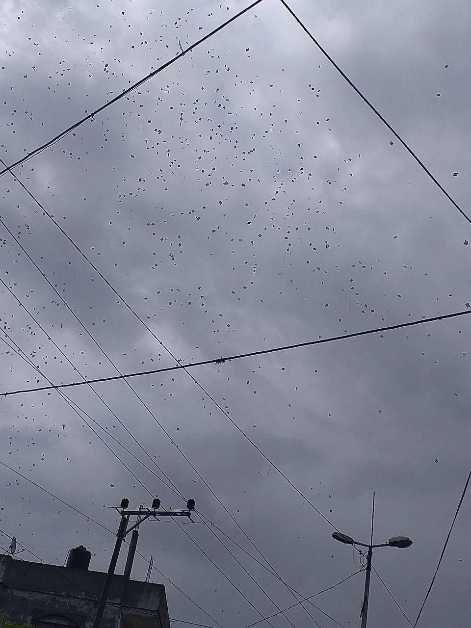 Izraelské síly shazují letáky s požadavkem, aby Palestinci v oblastech města Rafáh opustili své domovy.