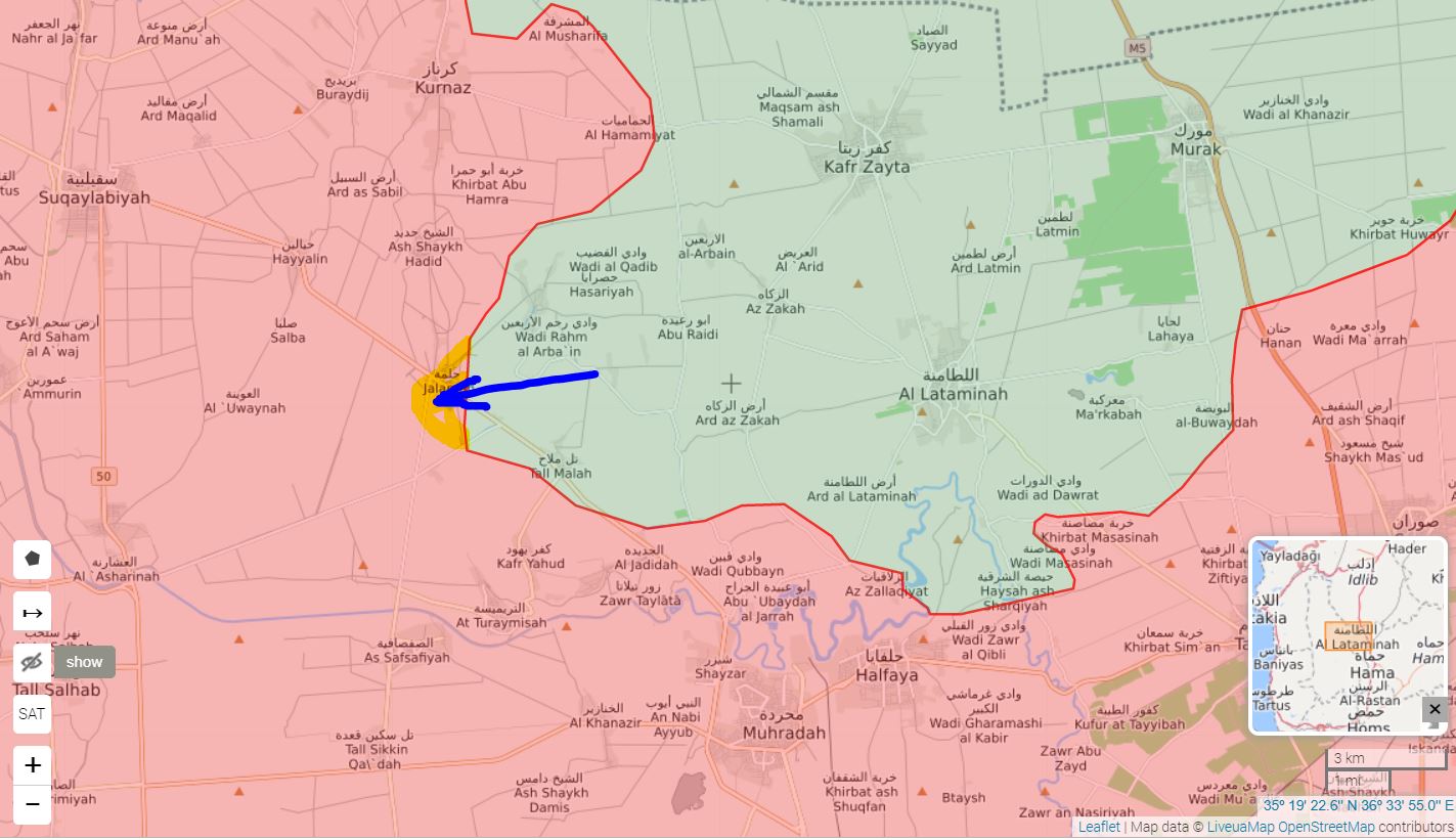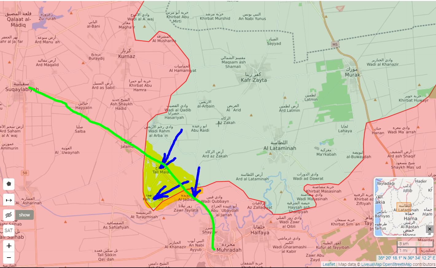 Zdroj uviedol, že sýrska arabská armáda vyhnala džihádistických rebelov aj z kľúčového vrchu Tal Malah. Tal Malah má výhľad na hlavnú cestu spájajúcu dve vládne pevnosti Mhardeh a Sqaylabiyeh. Sýrska armáda teraz útočí na mestečko Jibeen, ktoré bolo prvou lokalitou, ktorú minulú noc obsadili džihádistické sily.