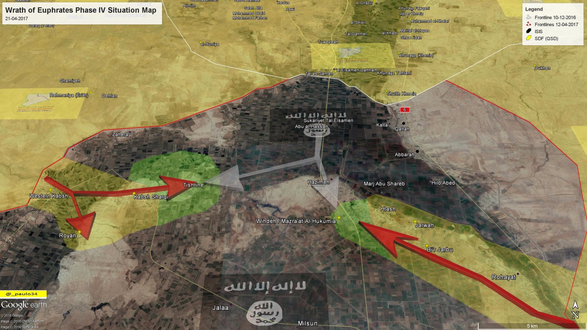 SDF+ postúpili aj z východu, obsadili Mazraat al-Hukumia a Tall Hazimah. Čeľuste klieští sú vzdialené cca 6 km.