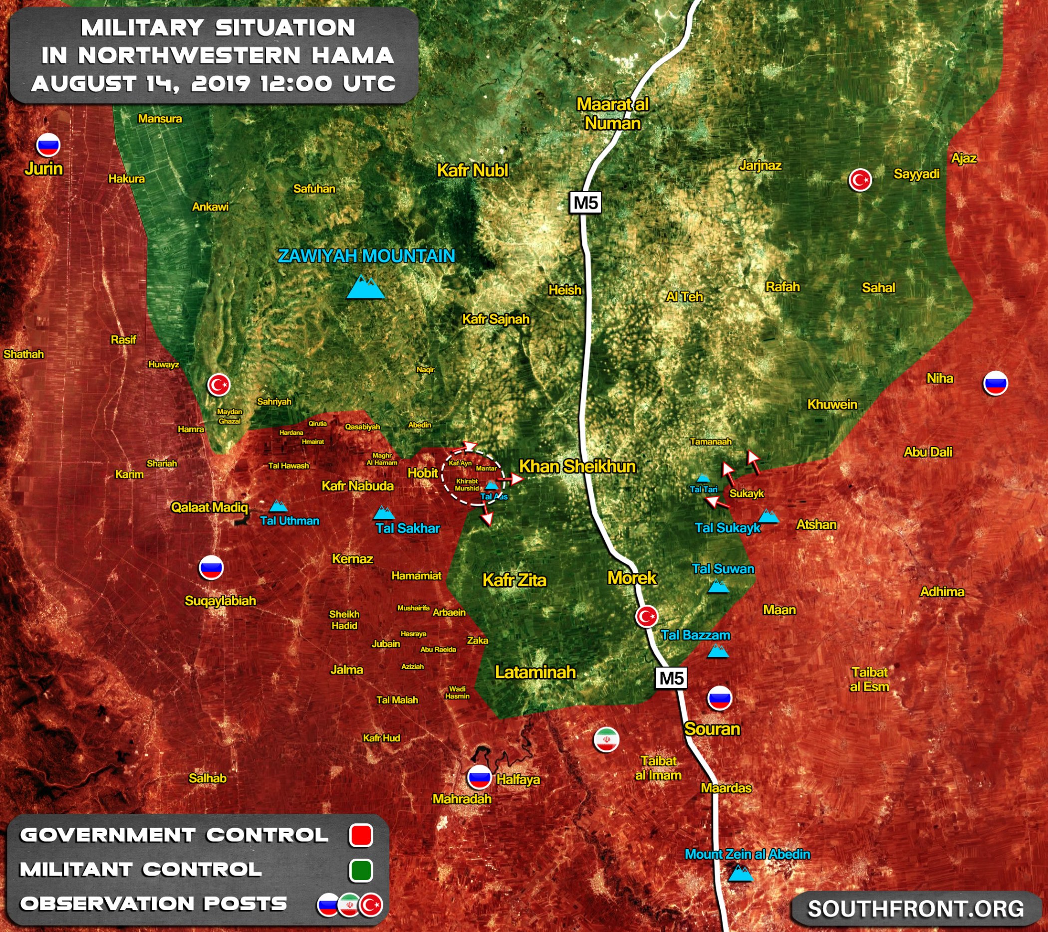 Odpoledne 14. srpna obnovila Sýrská arabská armáda (SAA) své pozemní operace západně od města Khan Shaykhun v jižním Idlibu a dokázala obsadit dvě nové vesnice. Podle pro-vládních zdrojů vojenské jednotky zabezpečily vesnice Umm Zaytunah a Kafr Tab pod ochranou těžkých ruských a syrských leteckých úderů.