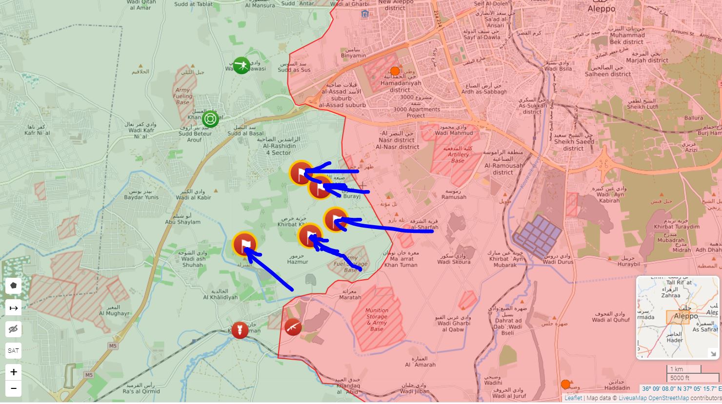 Správa Al-Mayadeena: Sýrska armáda a jej spojenci ovládajú Rašidín 5, Afghan Hill a farmy Khan Toman južne od Aleppa