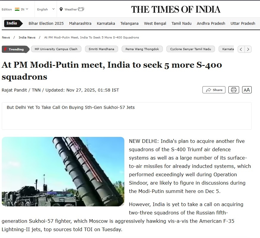 Taktiež počas Putinovej návštevy Indie v 12/2025 sa plánuje podpísať zmluva na 5 nových komplexov S-400.