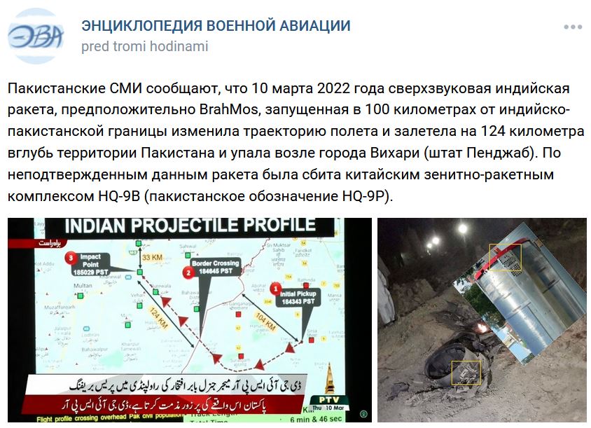 Pakistanské médiá uvádzajú, že štvrtok 10.03.2022 indická nadzvuková raketa, pravdepodobne BrahMos, vypustená 100km od indicko-pakistanskej hranice, zmenila dráhu letu a preletela 124 km hlboko na pakistanské územie a zrútila sa neďaleko mesta Vihari (štát Pandžáb). Podľa nepotvrdených správ bola raketa zostrelená čínskym protilietadlovým komplexom zem-vzduch HQ-9B (pakistanské označenie HQ-9P).