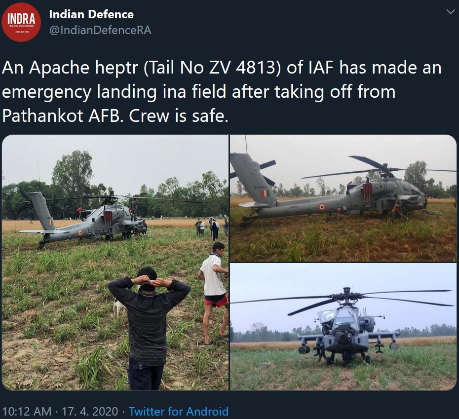 V piatok 17.04.2020 núdzové pristátie Indického bojového vrtuľníka Boeing AH-64E Apache, trupové označenie ZV4813 v poli potom, ako sa pilotovi "rozsvietilo červené tablo", nikomu sa nič nestalo, mašina je celá.