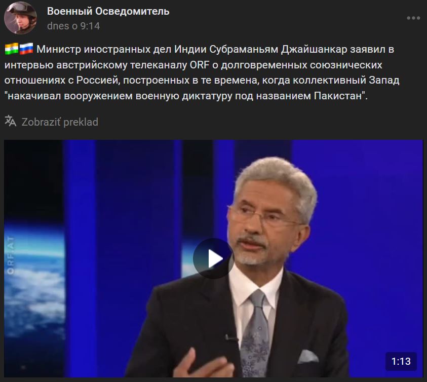 Minister zahraničných vecí Indie, Subramaniam Jaishankar odpovedal rakúskej televízii ORF o dlhoročnom spojenectve s Ruskom, ktoré vzniklo v čase, keď Západ "pumpoval zbrane do vojenskej diktatúry zvanej Pakistan".