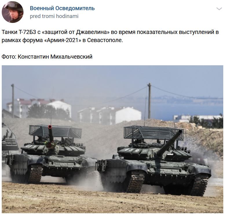 Rusko, Krym, Sevastopoľ, ukážky na "Armija-2021" (Армия-2021), tanky T-72B3 (Т-72Б3) s ochranou proti navádzaným raketám FGM-148 Javelin.